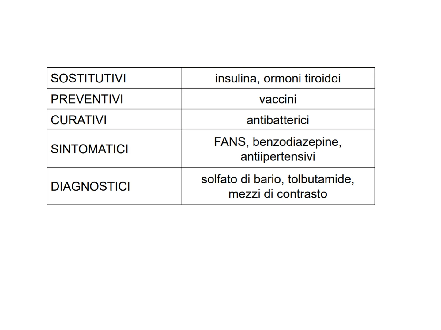 Da un punto di vista terapeutico e quindi sulla base dei loro effetti, i farmaci possono essere classificati come: SOSTITUTIVI insulina, ormoni tiroidei PREVENTIVI vaccini CURATIVI antibatterici SINTOMATICI FANS, benzodiazepine, antiipertensivi DIAGNOSTICI solfato di bario, tolbutamide, mezzi di contrasto