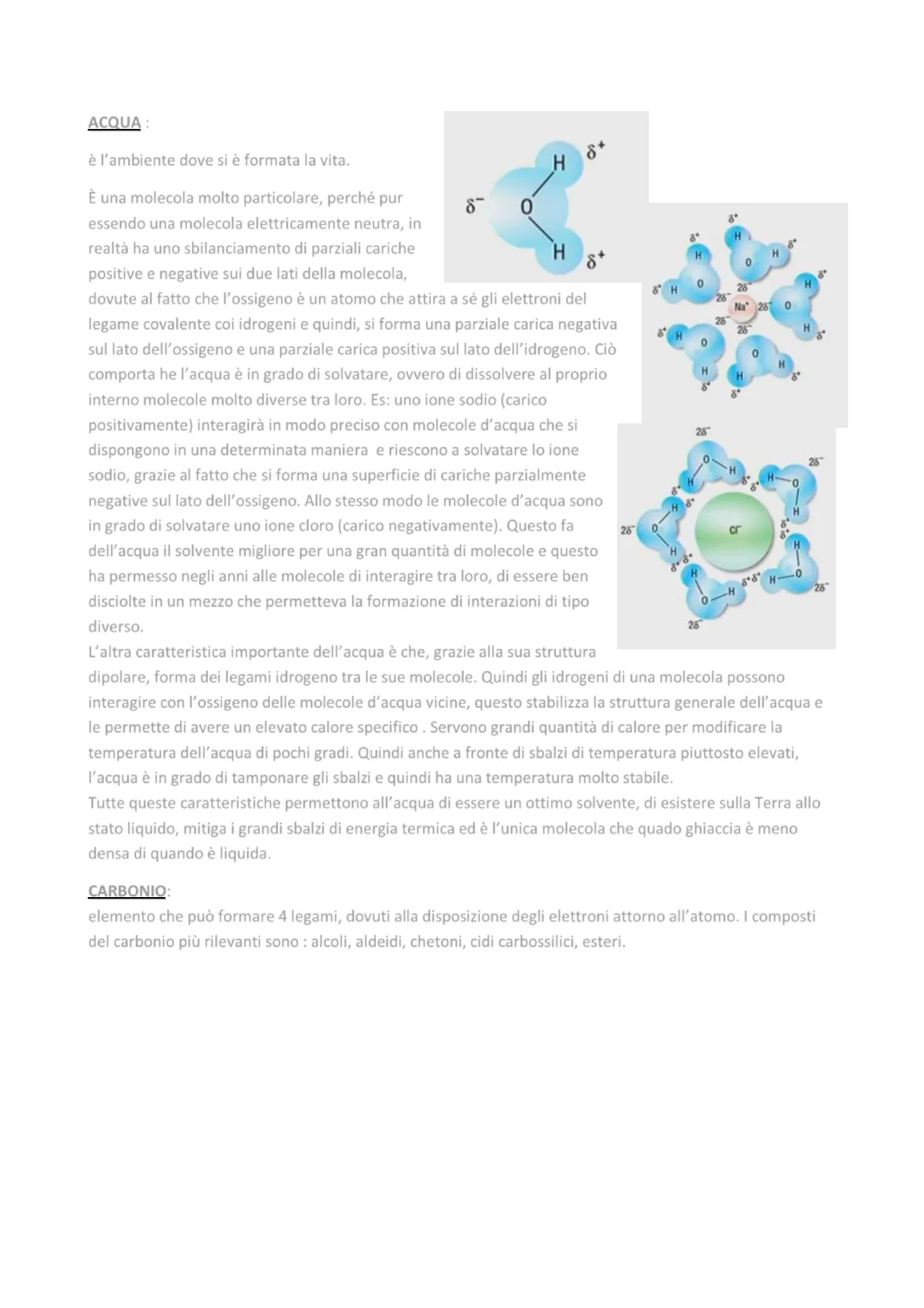 è l'ambiente dove si è formata la vita. È una molecola molto particolare, perché pur 8- 0 essendo una molecola elettricamente neutra, in realtà ha uno sbilanciamento di parziali cariche H 8+ positive e negative sui due lati della molecola, dovute al fatto che l'ossigeno è un atomo che attira a se gli elettroni del legame covalente coi idrogeni e quindi, si forma una parziale carica negativa sul lato dell'ossigeno e una parziale carica positiva sul lato dell'idrogeno. Ciò comporta he l'acqua è in grado di solvatare, ovvero di dissolvere al proprio interno molecole molto diverse tra loro. Es: uno ione sodio (carico positivamente) interagirà in modo preciso con molecole d'acqua che si dispongono in una determinata maniera e riescono a solvatare lo ione sodio, grazie al fatto che si forma una superficie di cariche parzialmente negative sul lato dell'ossigeno. Allo stesso modo le molecole d'acqua sono in grado di solvatare uno ione cloro (carico negativamente). Questo fa dell'acqua il solvente migliore per una gran quantità di molecole e questo ha permesso negli anni alle molecole di interagire tra loro, di essere ben disciolte in un mezzo che permetteva la formazione di interazioni di tipo diverso.