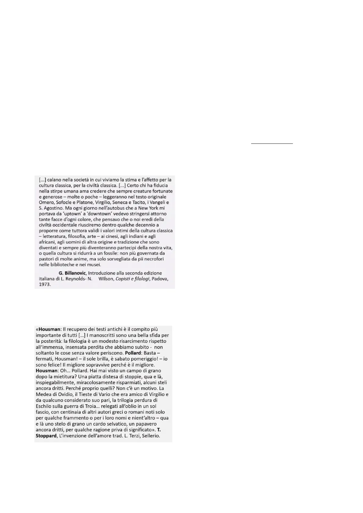 [ ... ] calano nella società in cui viviamo la stima e l'affetto per la cultura classica, per la civiltà classica. [ ... ] Certo chi ha fiducia nella stirpe umana ama credere che sempre creature fortunate e generose - molte o poche - leggeranno nel testo originale Omero, Sofocle e Platone, Virgilio, Seneca e Tacito, i Vangeli e S. Agostino. Ma ogni giorno nell'autobus che a New York mi portava da 'uptown' a 'downtown' vedevo stringersi attorno tante facce d'ogni colore, che pensavo che o noi eredi della civiltà occidentale riusciremo dentro qualche decennio a proporre come tuttora validi i valori intimi della cultura classica - letteratura, filosofia, arte - ai cinesi, agli indiani e agli africani, agli uomini di altra origine e tradizione che sono diventati e sempre più diventeranno partecipi della nostra vita, o quella cultura si ridurrà a un fossile: non più governata da pastori di molte anime, ma solo sorvegliata da pii necrofori nelle biblioteche e nei musei. G. Billanovic, Introduzione alla seconda edizione italiana di L. Reynolds- N. Wilson, Copisti e filologi, Padova, 1973.