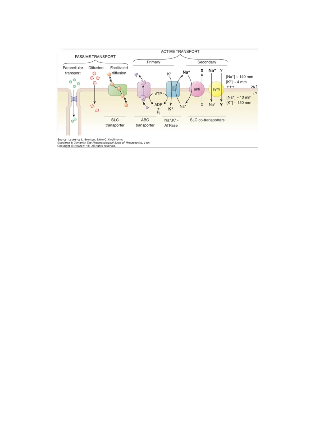 1ACTIVE TRANSPORT PASSIVE TRANSPORT Primary Secondary Paracellular transport Diffusion Facilitated diffusion Na+ K+ [Na+] ~ 140 mm [K+] ~ 4 mm +++ out anti sym ATP in [Na+] ~ 10 mm [K+] ~ 150 mm ADP V K+ Na+ X Na+ Y + P SLC transporter ABC transporter Na+,K+- ATPase SLC co-transporters Source: Laurence L. Brunton, Björn C. Knollmann: Goodman & Gilman's: The Pharmacological Basis of Therapeutics, 14e: Copyright @ McGraw Hill. All rights reserved.