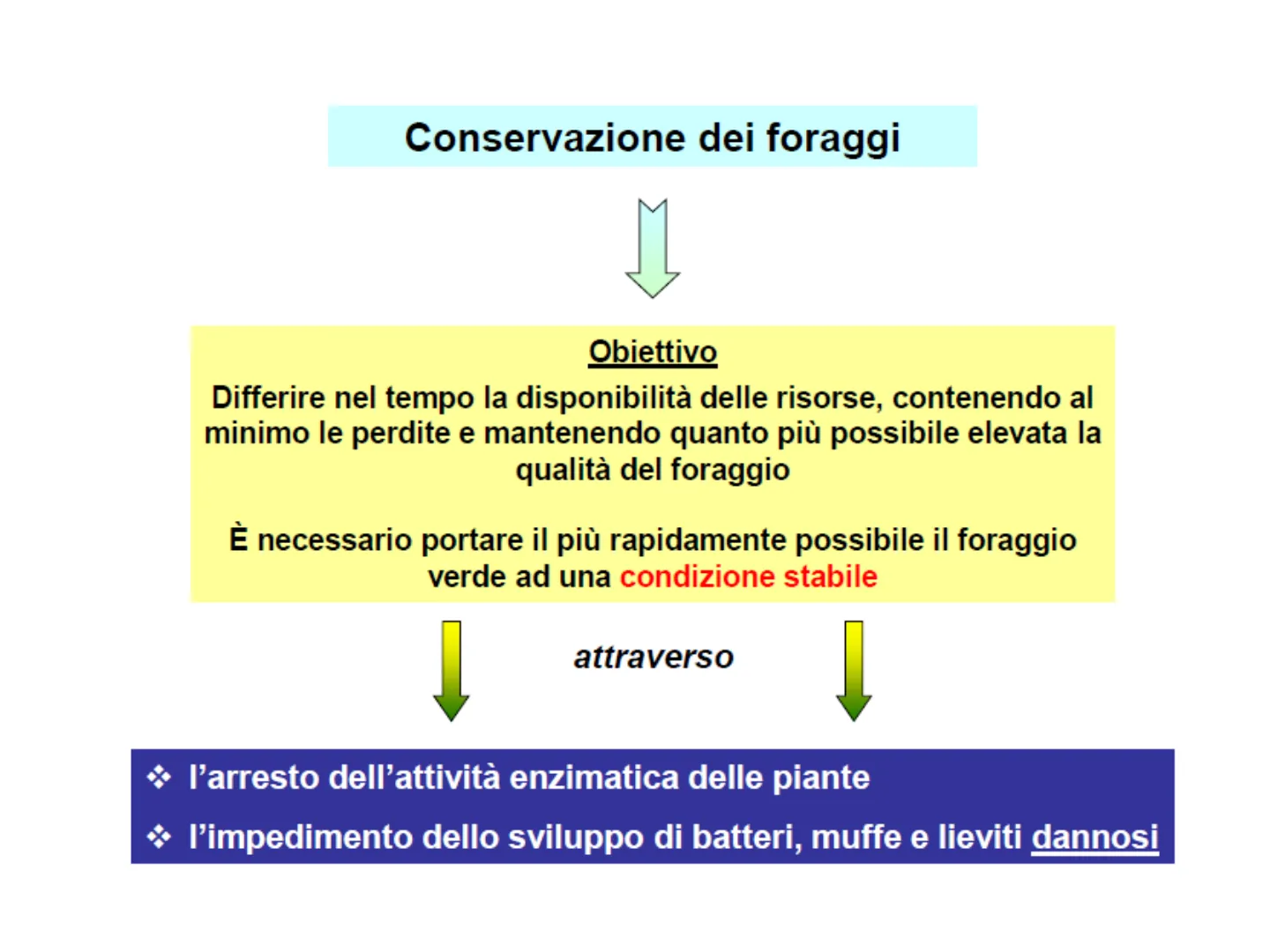 Differire nel tempo la disponibilità delle risorse, contenendo al minimo le perdite e mantenendo quanto più possibile elevata la qualità del foraggio È necessario portare il più rapidamente possibile il foraggio verde ad una condizione stabile attraverso l'arresto dell'attività enzimatica delle piante l'impedimento dello sviluppo di batteri, muffe e lieviti dannosi