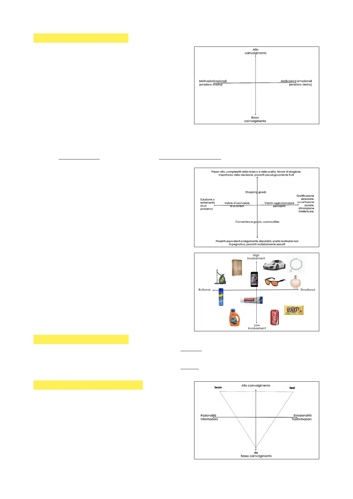 Non è un modello lineare ma un continuum. Non è più funzionale ma continua ad essere utilizzato poiché spiega il numero più alto possibile di cose con poche parole, utilizzando un piano cartesiano. Es. differenza tra detersivo e macchina: prezzo, Motivazioni emozionali (emisfero destro} commodity vs. bene di lusso, gratificazione sensoriale e simbolo di status, sforzo cognitivo pre-acquisto, conoscenza necessaria, frequenza di acquisto, prodotti materialmente finiti vs. psicologicamente fruiti (passaggio Basso coinvolgimento poi al mercato dell'usato, es. quando si cambia auto). Viene dunque fatta da una parte una valutazione razionale in base a ciò che mi serve, dall'altra una valutazione più guidata dall'emozione. Asse y = coinvolgimento / asse x = continuum razionalità-emozionalità. A ciascun quadrante corrisponde anche un modo diverso di comunicare. - alto: prezzo più alto, ricerca più complessa, paura di sbagliare, beni psicologicamente fruiti - basso: prodotti equivalenti e largamente disponibili, scelta routinaria che non richiede impegno, prodotti materialmente esauriti - sinistra: soluzione o evitamento a un problema - destra: gratificazione sensoriale, accettazione sociale e stimolazione intellettuale. Es. Gestalt: come il grafico di Vaughn, rappresenta i vari modi di vedere le cose. Prezzo alto, complessità della ricerca e della scelta, timore di sbagliare, importanza della decisione, prodotti psicologicamente fruiti Shopping goods Gratificazione sensoriale, evitamento Valore d'uso/valore Valore aggiunto/valore accettazione di un di scambio percepito stimolazione intellettuale, Convenience goods, commodities Prodotti equivalenti e largamente disponibili, scelta routinaria non impegnativa, prodotti materialmente esauriti High Involvement Rational Emotional laid Colgate Coca Cola Low Involvement MESSAGGI ANALOGICI E DIGITALI - Lato sinistro: digitale, verbale, analitico, informativo, mimesis (descrivere una cosa il più dettagliatamente possibile), prodotto - Lato destro: analogico, visivo, sintetico, connotativo, poiesis (fare), marca. FCB GRID E GERARCHIA DEGLI EFFETTI Se incrociamo le due cose, ovvero la matrice di Vaughn e la Gerarchia degli Effetti di Lavidge e Steiner ne risulta questo: learn Alto coinvolgimento feel Razionalità Informazioni Emozionalità Trasformazioni do Basso coinvolgimento