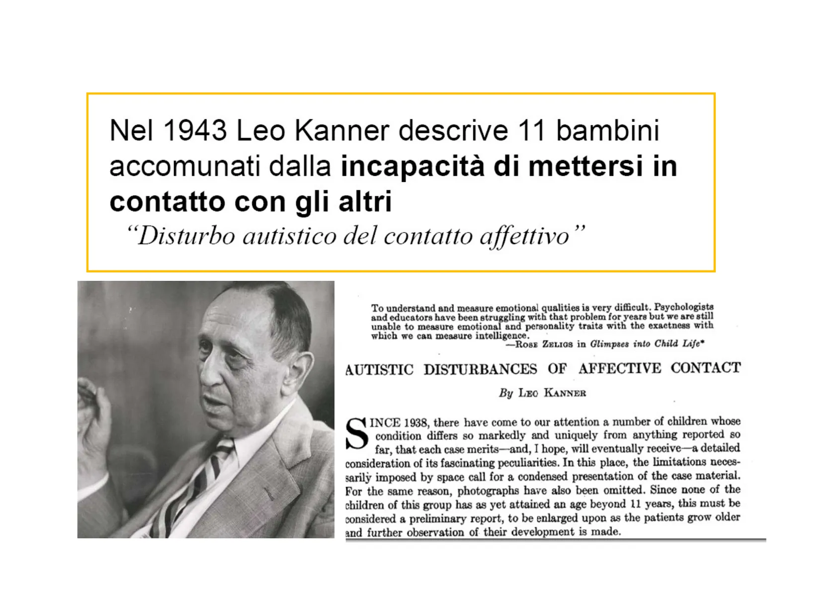 AUTISMO : LE ORIGINI Nel 1943 Leo Kanner descrive 11 bambini accomunati dalla incapacità di mettersi in contatto con gli altri "Disturbo autistico del contatto affettivo" To understand and measure emotional qualities is very difficult. Psychologists and educators have been struggling with that problem for years but we are still unable to measure emotional and personality traits with the exactness with which we can measure intelligence. -ROSE ZELIGS in Glimpses into Child Life*