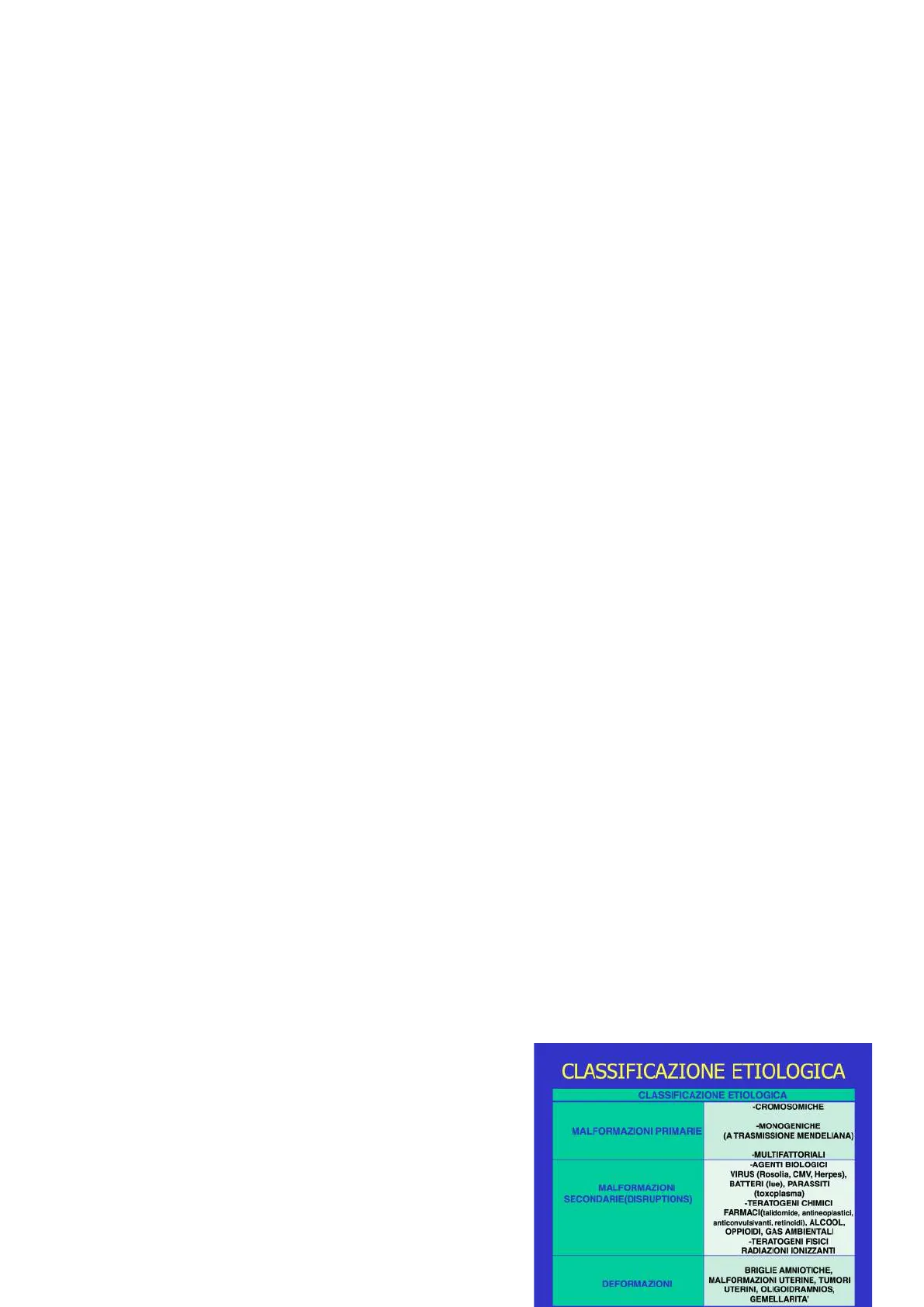 Di fronte a soggetti che presentano una condizione polimalformativa, l'analisi del fenotipo non può essere disgiunta dalla ricerca della base etimologica (origine) e delle dinamiche patogenetiche del difetto. Il criterio di classificazione più diffuso è, quindi, quello etimologico che distingue malformazioni primarie, secondarie (o disruptions) e deformazioni. Le "malformazioni primarie" sono difetti della morfogenesi CLASSIFICAZIONE ETIOLOGICA CLASSIFICAZIONE ETIOLOGICA -CROMOSOMICHE MALFORMAZIONI PRIMARIE -MONOGENICHE (A TRASMISSIONE MENDELIANA) MALFORMAZIONI SECONDARIE(DISRUPTIONS) -MULTIFATTORIALI AGENTI BIOLOGICI VIRUS (Rosolia, CMV, Herpes), BATTERI (lue), PARASSITI (toxoplasma) -TERATOGENI CHIMICI FARMACI(talidomide, antineoplastici, anticonvulsivanti, retinoidi), ALCOOL, OPPIOIDI, GAS AMBIENTALI -TERATOGENI FISICI RADIAZIONI IONIZZANTI DEFORMAZIONI BRIGLIE AMNIOTICHE, MALFORMAZIONI UTERINE, TUMORI UTERINI, OLIGOIDRAMNIOS, GEMELLARITA'Prof. Villa Esame 23/04/2024 risultanti da un errore intrinseco del processo di sviluppo presente sin dal concepimento. Queste malformazioni hanno, quindi, un'origine genetica. Le "disruptions o malformazioni secondarie" si verificano in un prodotto del concepimento che, avviati i suoi processi di sviluppo con modalità e cronologia normali, subisce per opera di fattori ambientali un arresto globale o dei danni settoriali su singoli campi di sviluppo. Le disruptions: queste alterazioni possono avere natura vascolare (da interruzione del flusso ematico che irrora uno o più campi di sviluppo durante la differenziazione) o essere provocate da agenti teratogeni (di natura biologica, fisica o chimica); possono estrinsecarsi con un singolo difetto ovvero assumere una dinamica sequenziale con un meccanismo a cascata.