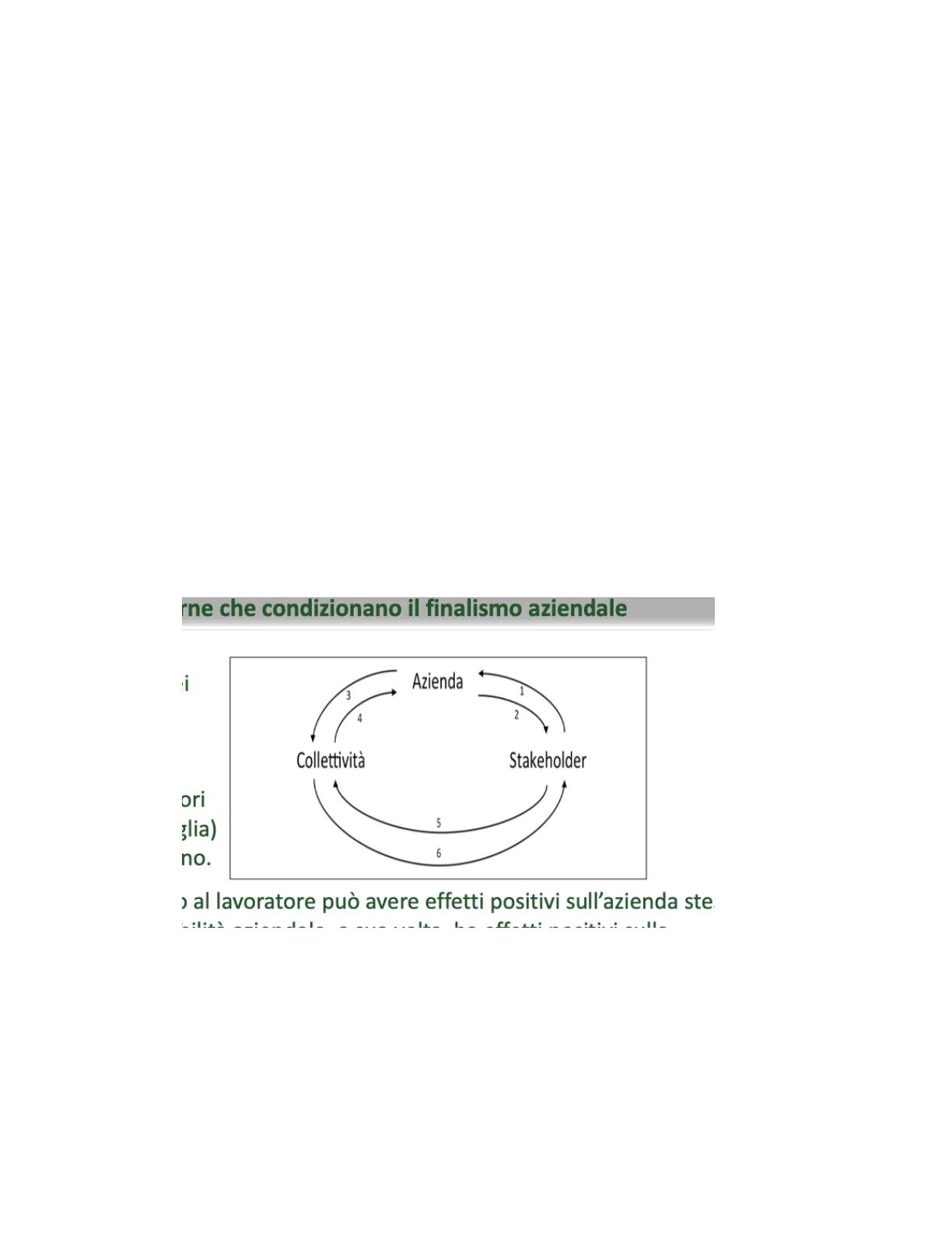 Una serie di forze interne ed esterne producono effetti positivi o negativi sui rapporti azienda- stakeholder-collettività. Tali rapporti sono di tipo circolare e comportano responsabilità di tipo giuridica ed etica. Ad esempio un'azienda che rispetta la dignità dei dipendenti non solo avrà favorito il loro benessere ma anche quello della collettività in quanto i dipendenti appartengono alla collettività. rne che condizionano il finalismo aziendale Azienda 3 1 4 2 Collettività Stakeholder pri glia) 5 no. 6 › al lavoratore può avere effetti positivi sull'azienda ste L !!! - L_ _ _ CC. L'azienda può quindi contribuire a migliorare la vita delle persone al suo interno e al di fuori di essa. Una volta individuato il fine è opportuno individuare le forze interne ed esterne che sono favorevoli o contrarie. Per fare questo bisogna conoscere: