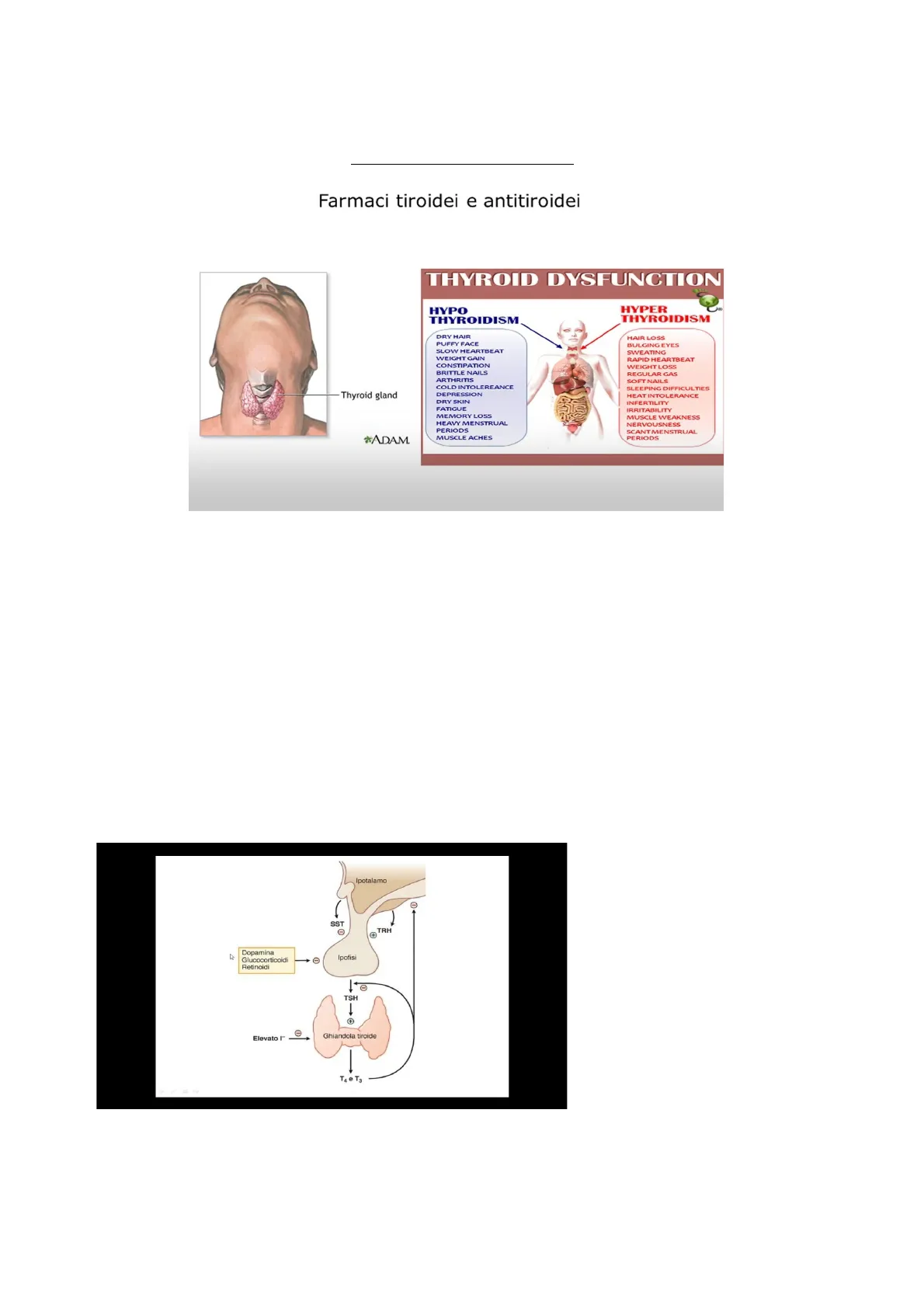 I farmaci tiroidei e antitiroidei sono importanti perchè ipertiroidismo e ipotiroidismo hanno elevata incidenza nella popolazione. Di conseguenza è importante la conoscenza di questi farmaci anche da parte del medico di base che è chiamato a seguire questi pazienti nell'arco di tutta la loro vita , sebbene siano patologie di carattere specialistico e quindi seguite da un endocrinologo di riferimento. Abbiamo detto nella lezione precedente che Ipofisi, Ipotalamo e ormoni periferici sono finemente regolati, per quello che riguarda la tiroide vediamo che l'ipotalamo rilascia TRH che agisce a livello ipofisario; viene così attivata la liberazione di TSH che agisce sulla ghiandola tiroidea che libererà gli ormoni tiroidei T4 e T3.