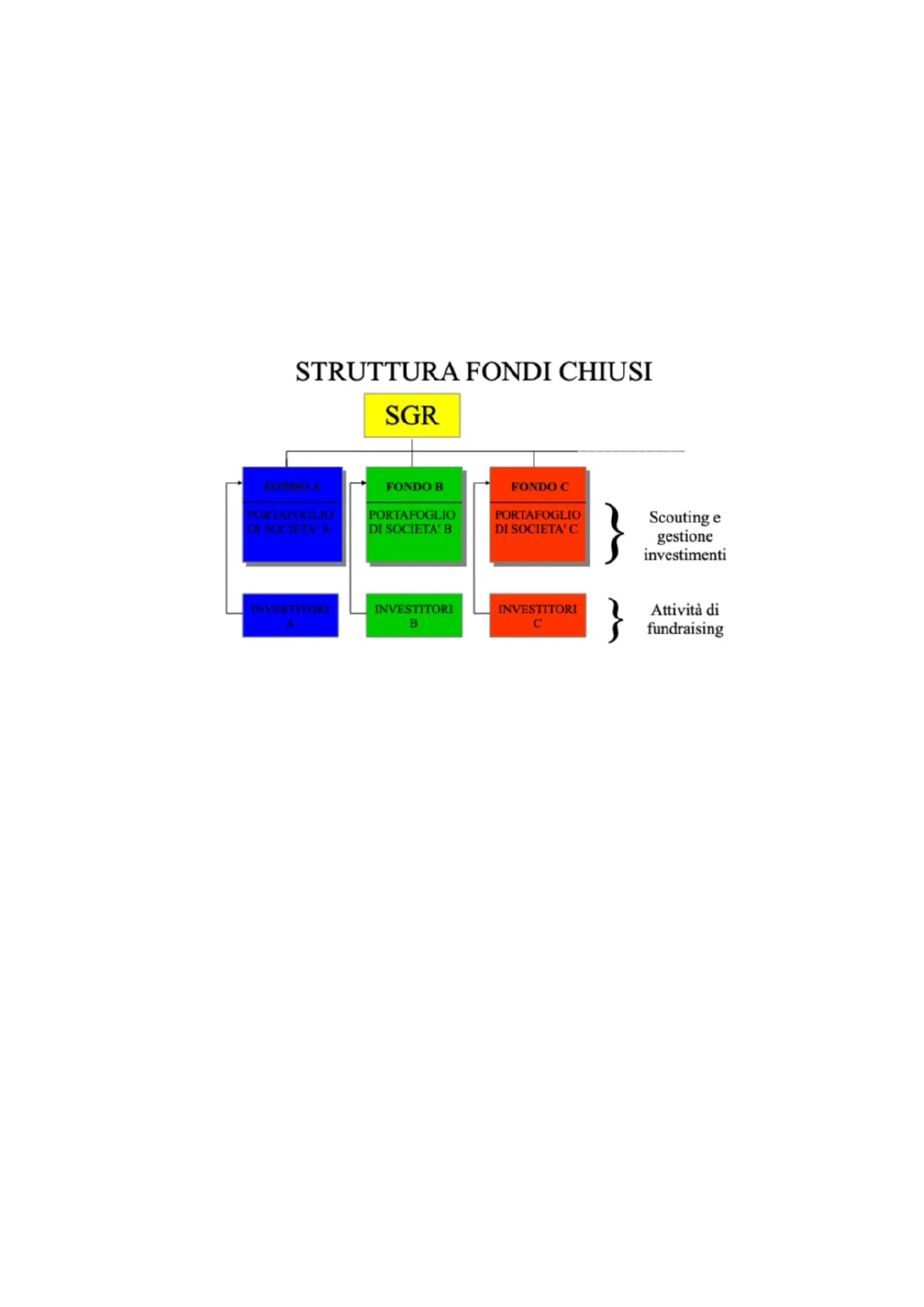 Una volta istituita la SGR ha luogo il fundraising e l'istituzione/creazione del fondo/fondi, i quali investiranno in società target ritenute idonee in fase di scouting. La SGR poi monitora l'investimento fatto e va poi a gestire il capital gain e il disinvestimento puntando alla generazione di valore per i sottoscrittori del fondo comune chiuso. P.S. Esiste tuttavia un'autonomia patrimoniale tra fondo e SGR di modo che il capitale raccolto non diventi proprietà della SGR. N.B. Possono presentarsi situazioni in cui una SGR gestisce più fondi attraverso una gestione a monte. Questa situazione si ha perché ogni fondo ha come target un determinato tipo di azienda definito ex ante => la presenza di più fondi permette di avere più tipi di aziende oggetto dello scouting. La SGR amministra e gestisce i fondi, i quali hanno dei loro scopi e delle loro politiche di investimento. I tre fondi mostrati nello schema sono differenti per finalità: il fondo A è stato istituito per l'acquisizione di società appartenenti al comparto del lusso, il fondo B per l'hi-tech e il fondo C per società appartenenti al ramo della comunicazione.