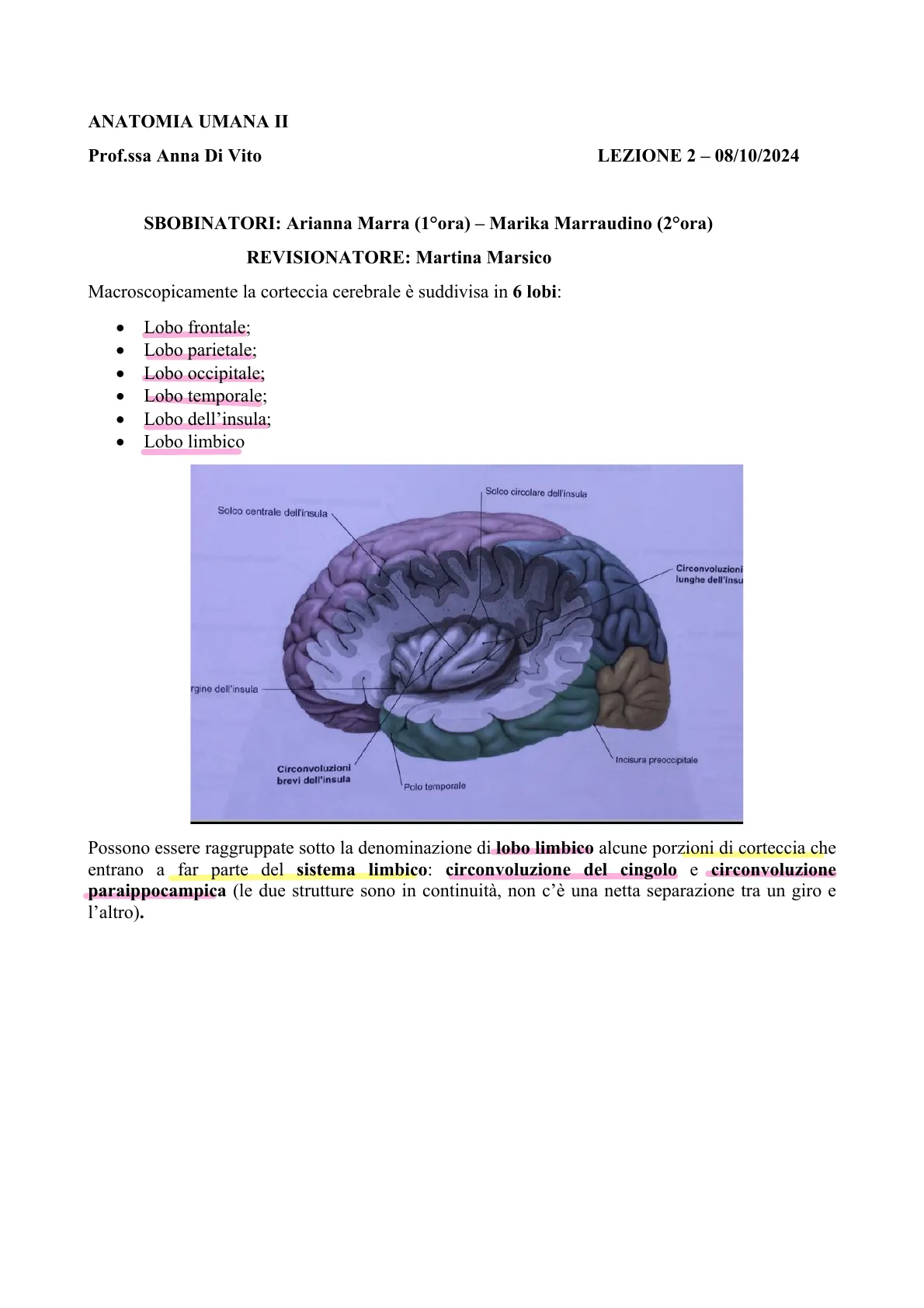 Documento della Prof.ssa Anna di Vito su Anatomia Umana II. Il Pdf esplora l'anatomia macroscopica della corteccia cerebrale, focalizzandosi su lobi, aree funzionali e mappe corticali. Questi appunti universitari di Biologia, con diagrammi esplicativi, sono utili per lo studio autonomo.