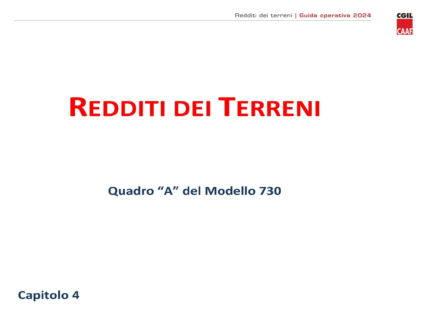 Slide da Cgil Caaf sui Redditi dei terreni: guida operativa 2024. Il Pdf, utile per concorsi pubblici in Diritto, fornisce una panoramica dettagliata sulla compilazione del Quadro A del Modello 730, includendo esenzioni IMU per terreni agricoli e variazioni dei valori di reddito dominicale e agrario.