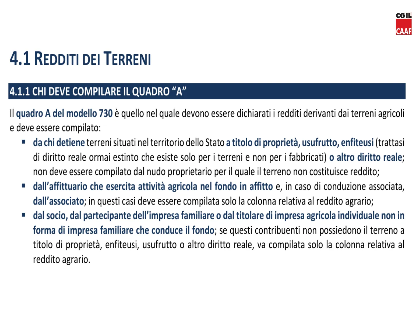 Il quadro A del modello 730 è quello nel quale devono essere dichiarati i redditi derivanti dai terreni agricoli