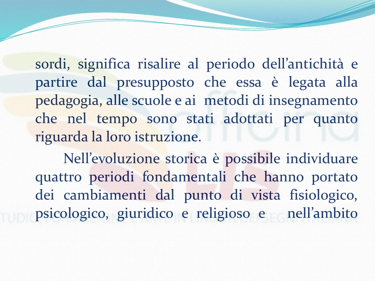 Nell'evoluzione storica è possibile individuare quattro periodi fondamentali che hanno portato dei cambiamenti dal punto di vista fisiologico, psicologico, giuridico e religioso e nell'ambito culturale ed educativo delle persone sorde.
