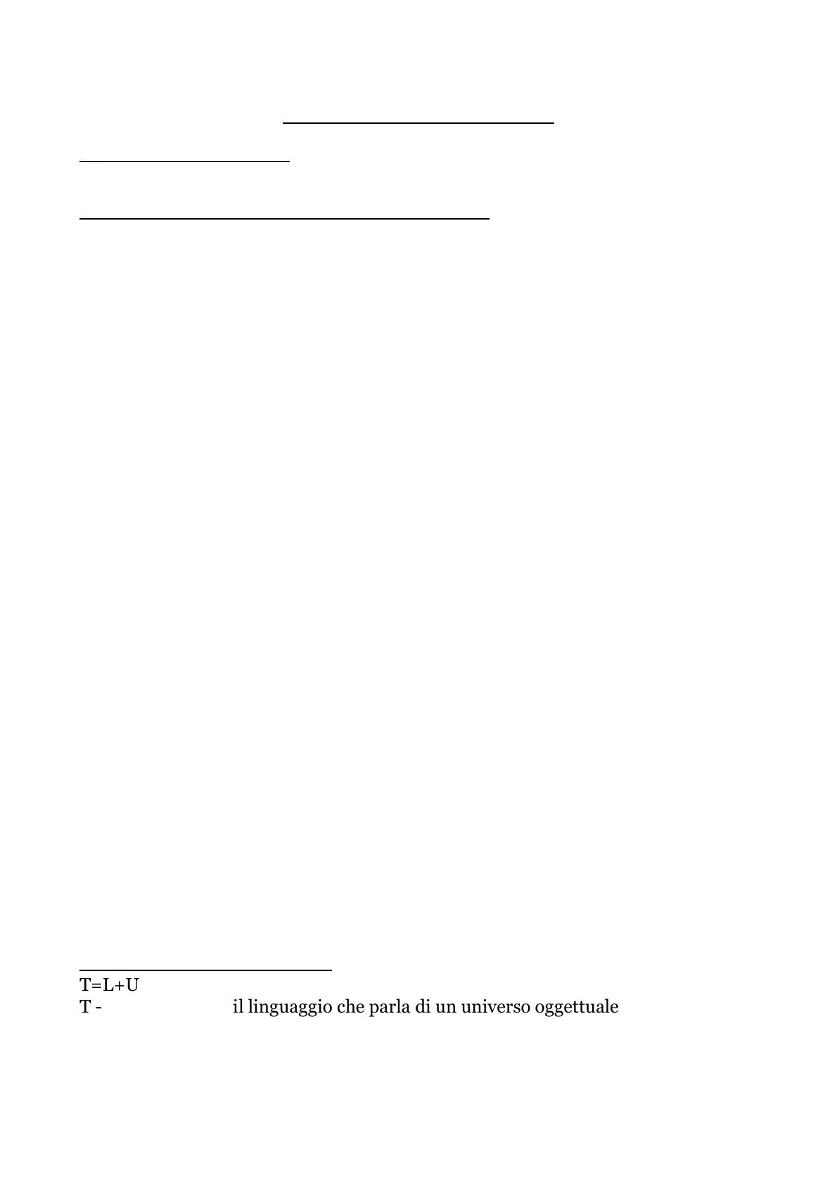 T=L+U T -> teoria, ovvero il linguaggio che parla di un universo oggettuale La definizione dipende dalla concezione del linguaggio dell'800, in quanto questo veniva considerato la parte fondamentale, molto più importante del contenuto. (Importa più il mezzo per esprimerlo che il contenuto stesso)U -> Universo o ambito oggettuale o dominio di realtà. Insieme di oggetti provvisti di proprietà e relazioni, accumunati da un tema/argomento (universo oggettuale della psicologia è diverso dall'universo oggettuale della fisica delle stringhe) L -> linguaggio, ovvero le varie frasi che mettono in relazione gli oggetti dell'universo oggettuale.