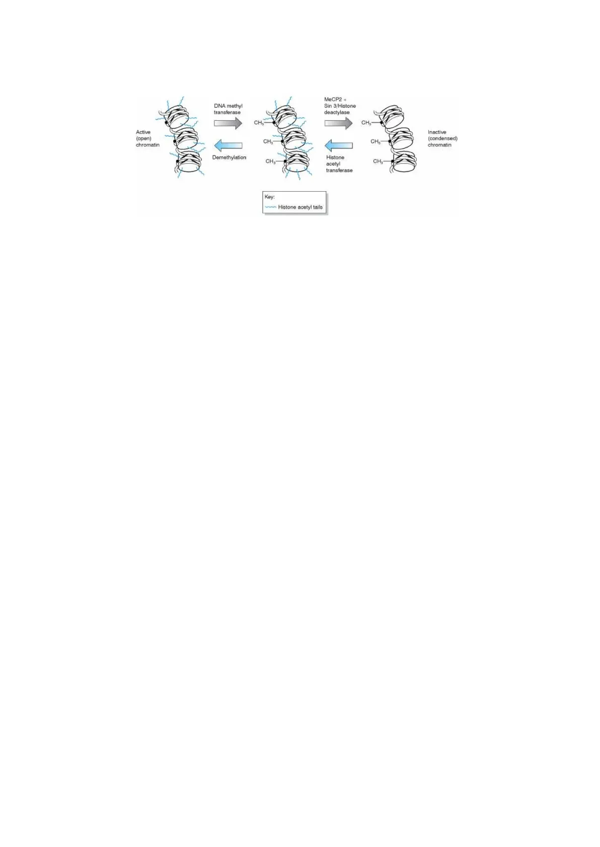 DNA methyl transferase MeCP2 + Sin 3/Histone deactylase CH3 CH Active (open) chromatin CH3 CH Inactive (condensed) chromatin Demethylation CH3 Histone acetyl transferase CH3 Key: ~ Histone acetyl tails