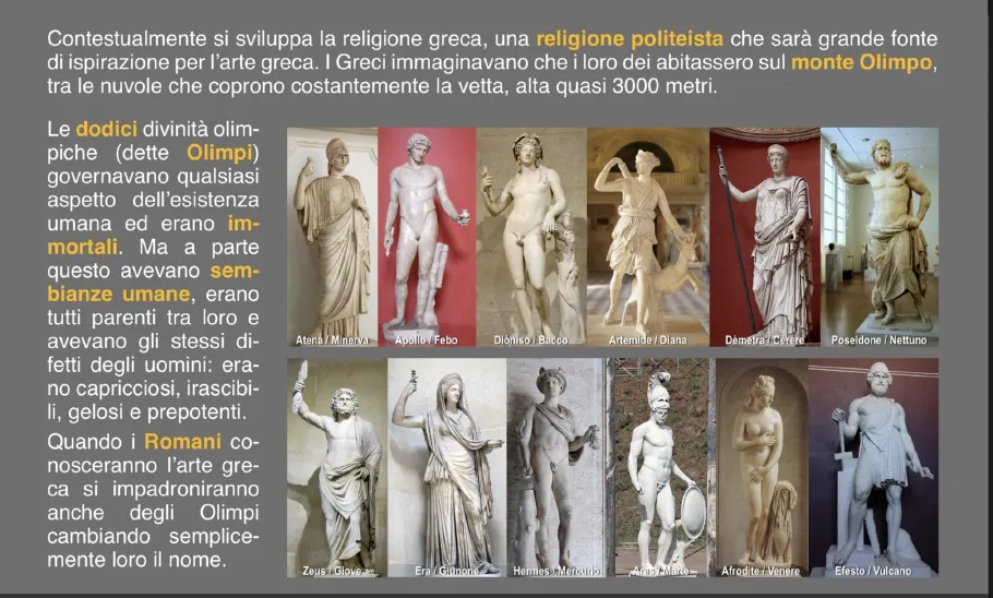 Linea del tempo: cronologia delle civiltà classiche Corinto Samo o Mileto oSidé Tera PRodi Calcide Focea Megar oEretria Elea Naucratis Reggio Selinunte · Catania BisanzioContestualmente si sviluppa la religione greca, una religione politeista che sarà grande fonte di ispirazione per l'arte greca. I Greci immaginavano che i loro dei abitassero sul monte Olimpo, tra le nuvole che coprono costantemente la vetta, alta quasi 3000 metri.