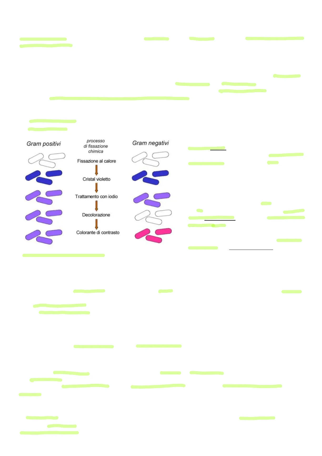 La differenza tra i due gruppi è basata proprio sulla composizione delle due differenti pareti batteriche: i Gram positivi, infatti, presentano la parete composta da uno strato spesso di peptidoglicano; nei Gram negativi invece, lo strato di peptidoglicano è molto più ridotto e lo ritroviamo all'interno di un spazio denominato spazio periplasmatico, esternamente, troviamo una membrana esterna costituita da lipopolisaccaridi e proteine. Alla fine della colorazione, i batteri possono assumere due colori: