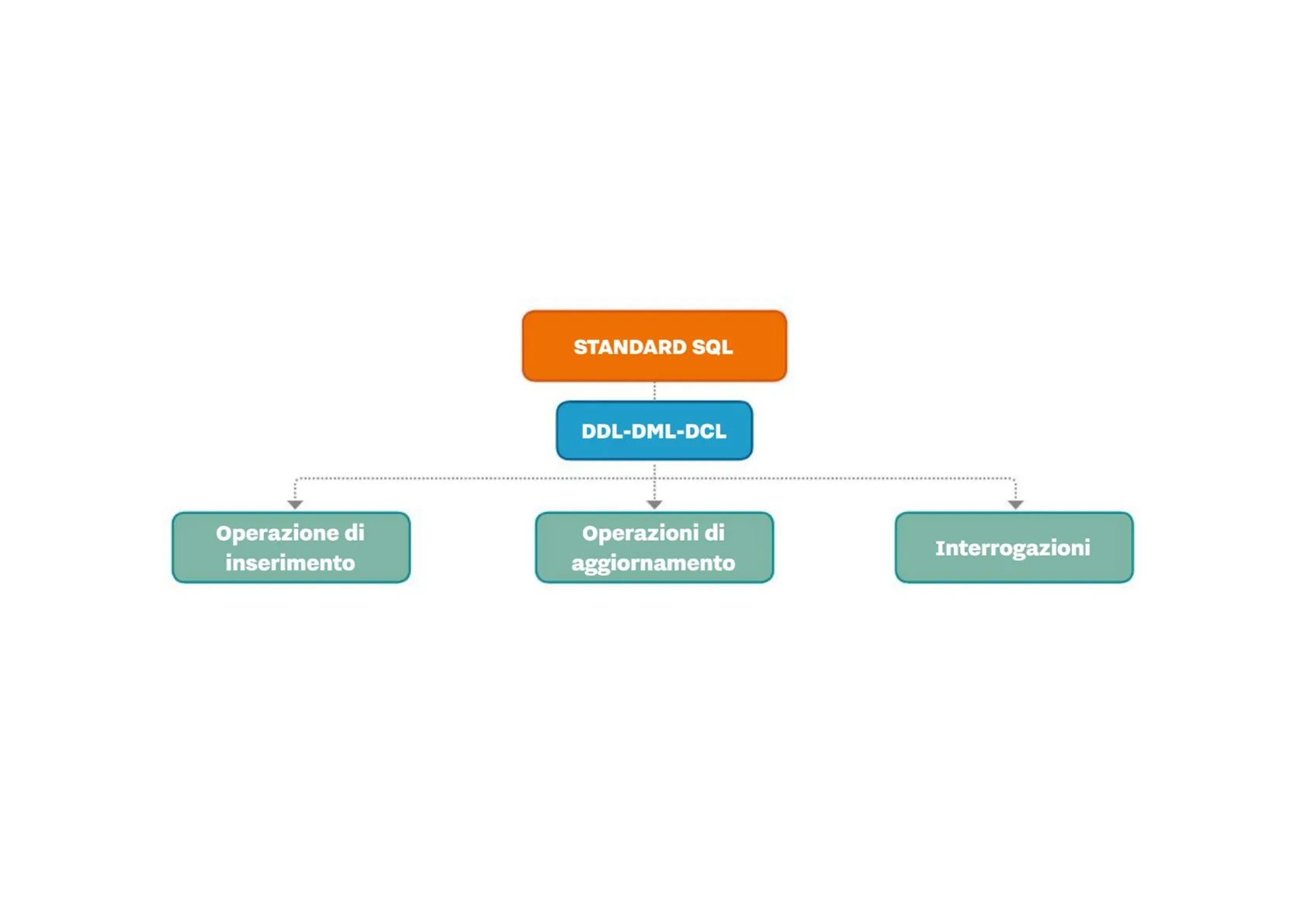 Il linguaggio SQL assolve alle funzioni di: DDL (Data Definition Language), che prevede le istruzioni per definire la struttura delle relazioni della base di dati. Serve quindi a creare tabelle, vincoli, viste e così via; DML (Data Manipulation Language), che prevede le istruzioni per manipolare i dati contenuti nelle diverse tabelle; in particolare permette inserimenti cancellazioni e modifiche delle righe delle tabelle. nonche di effettuare interrogazioni sulle basi di dati DCL (Data Control Language), che prevede istruzioni per controllare il modo in cui le operazioni vengono eseguite; consente di gestire il controllo degli accessi per più utenti e i permessi per gli utenti autorizzati