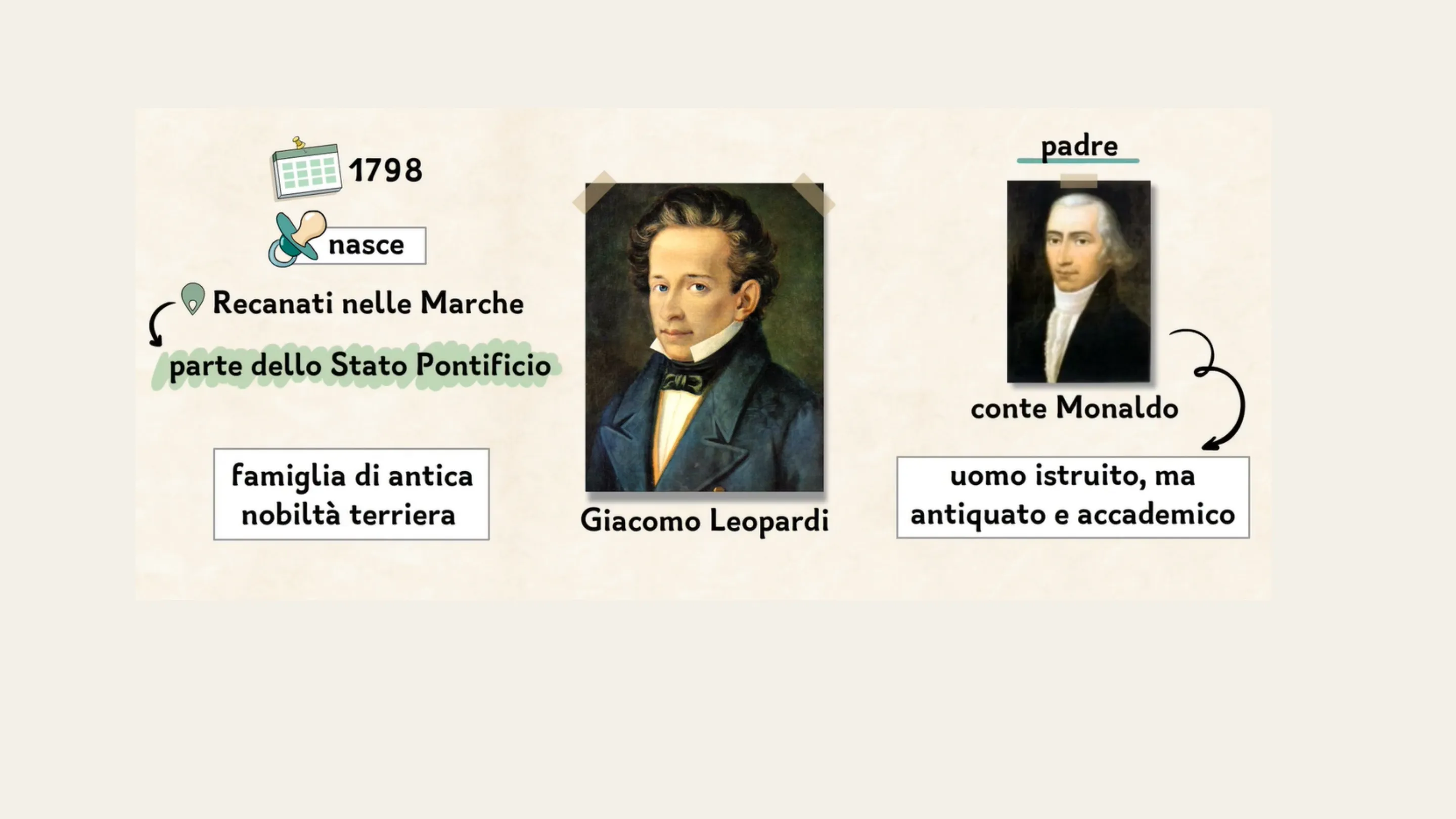GIACOMO LEOPARDI padre 1798 nasce Recanati nelle Marche parte dello Stato Pontificio conte Monaldo famiglia di antica nobiltà terriera Giacomo Leopardi uomo istruito, ma antiquato e accademico L'ambiente in cui cresce Leopardi è bigotto e conservatore. Inizialmente viene istruito da precettori ecclesiastici, ma ben presto prosegue i suoi studi da solo, grazie ai testi presenti nella ricchissima biblioteca paterna.passa molto tempo a studiare nella biblioteca di famiglia