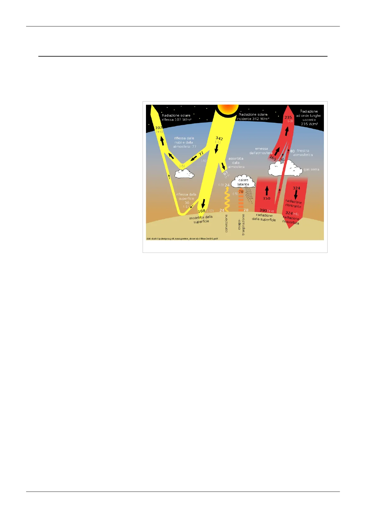 Effetto serra L'effetto serra è un fenomeno naturale che entra a far parte dei complessi meccanismi di regolazione dell'equilibrio termico di un pianeta o di un satellite grazie alla presenza di un'atmosfera contenente alcuni gas. Questi, per le proprie particolari proprietà molecolari, riflettono oppure assorbono e riemettono la radiazione infrarossa; il nome deriva dunque dalla similitudine con quanto avviene nelle serre per la coltivazione. I raggi solari a corta lunghezza d'onda penetrano facilmente nell'atmosfera raggiungendo in buona parte la superficie del pianeta, dove vengono in parte riflessi ed in parte assorbiti dalla superficie e convertiti in calore. Il calore viene dissipato verso lo spazio sotto forma di irraggiamento infrarosso, secondo la legge del corpo nero o legge di Stefan-Boltzmann. L'interferenza dei gas serra alla dissipazione della radiazione infrarossa comporta l'innalzamento della temperatura superficiale fino al raggiungimento di un punto di equilibrio tra radiazione solare in arrivo e infrarossa in uscita. Radiazione solare riflessa 107 W/m2 Radiazione solare incidente 342 W/m2 235 (-3) Radiazione ad onde lunghe uscente 235 W/m2 107 (+4) riflessa dalle nubi e dalla atmosfera: 77 342 (-1 emessa dall'atmosfera 140 finestra atmosferica 165 30 (-5) atmosfera gas serra 67 (+9) calore latente (-3) 24 324 78 (-5 350 radiazione rientrante 168 (-13) 24 78 390(+4) radiazione dalla superficie assorbita dalla superficie convezione evapo- traspirazione 324(+5) radiazione riassorbita dati dahttp:/eosp so.g sft.nasa.gov/eos_ob serv/p dif/Nov-Dec0 6.pdf Scambio radiativo ed influenza dell'effetto serra atmosferico. In assenza di gas serra la temperatura superficiale media della Terra sarebbe di circa -18 ℃ mentre il valore effettivo è di circa +14 °℃, molto al di sopra del punto di congelamento dell'acqua, il che consente la vita come noi la conosciamo. È importante rilevare che l'acqua, sotto forma di vapore, costituisce essa stessa il più potente gas serra atmosferico.