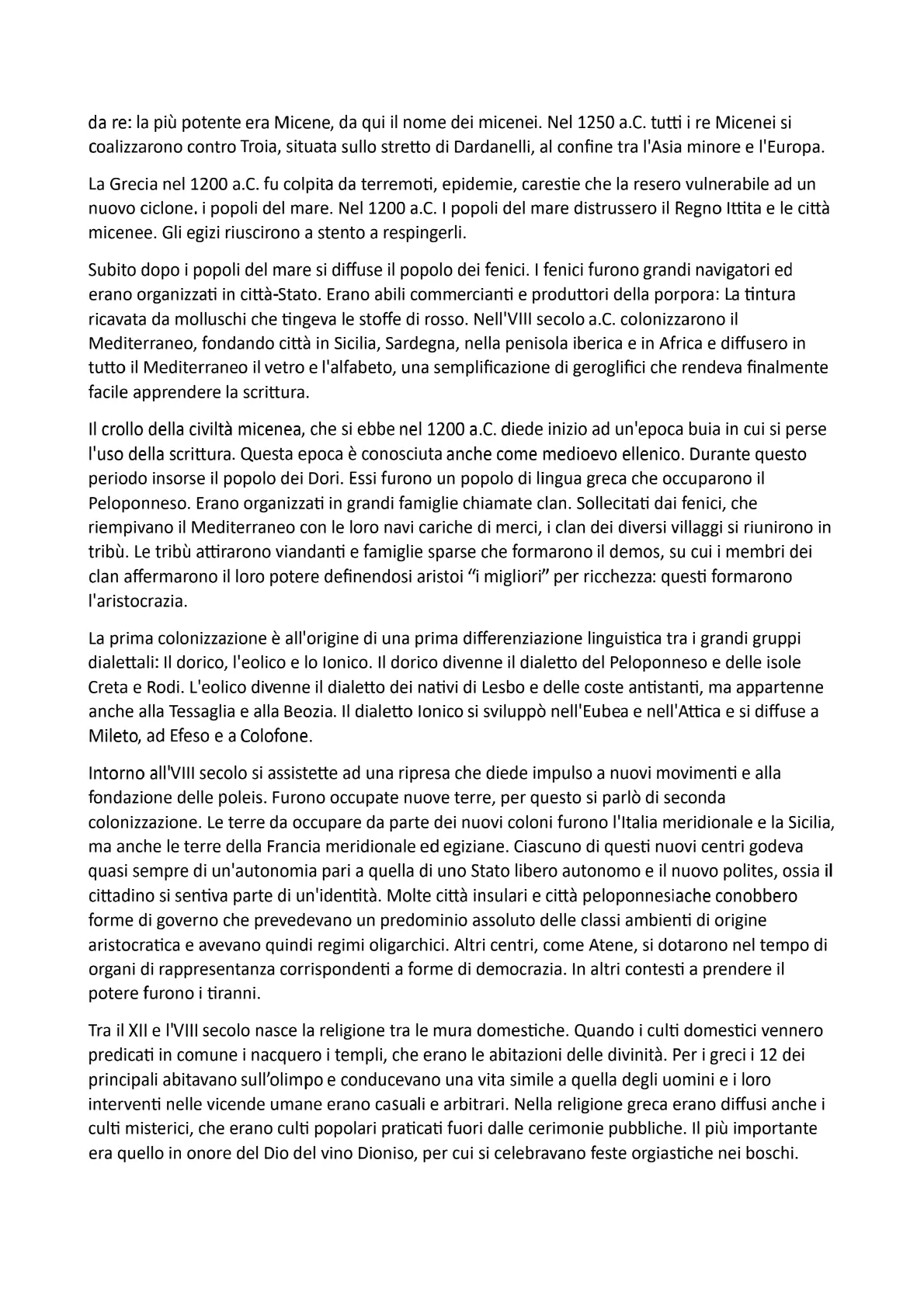 Gli achei erano tribù indoeuropee provenienti dalla Russia meridionale. Nel 2000 a.C. giunsero in Grecia, ma la loro economia decollò molto presto. Gli Achei fondarono numerose città, governateda re: la più potente era Micene, da qui il nome dei micenei. Nel 1250 a.C. tutti i re Micenei si coalizzarono contro Troia, situata sullo stretto di Dardanelli, al confine tra l'Asia minore e l'Europa. La Grecia nel 1200 a.C. fu colpita da terremoti, epidemie, carestie che la resero vulnerabile ad un nuovo ciclone. i popoli del mare. Nel 1200 a.C. I popoli del mare distrussero il Regno Ittita e le città micenee. Gli egizi riuscirono a stento a respingerli.