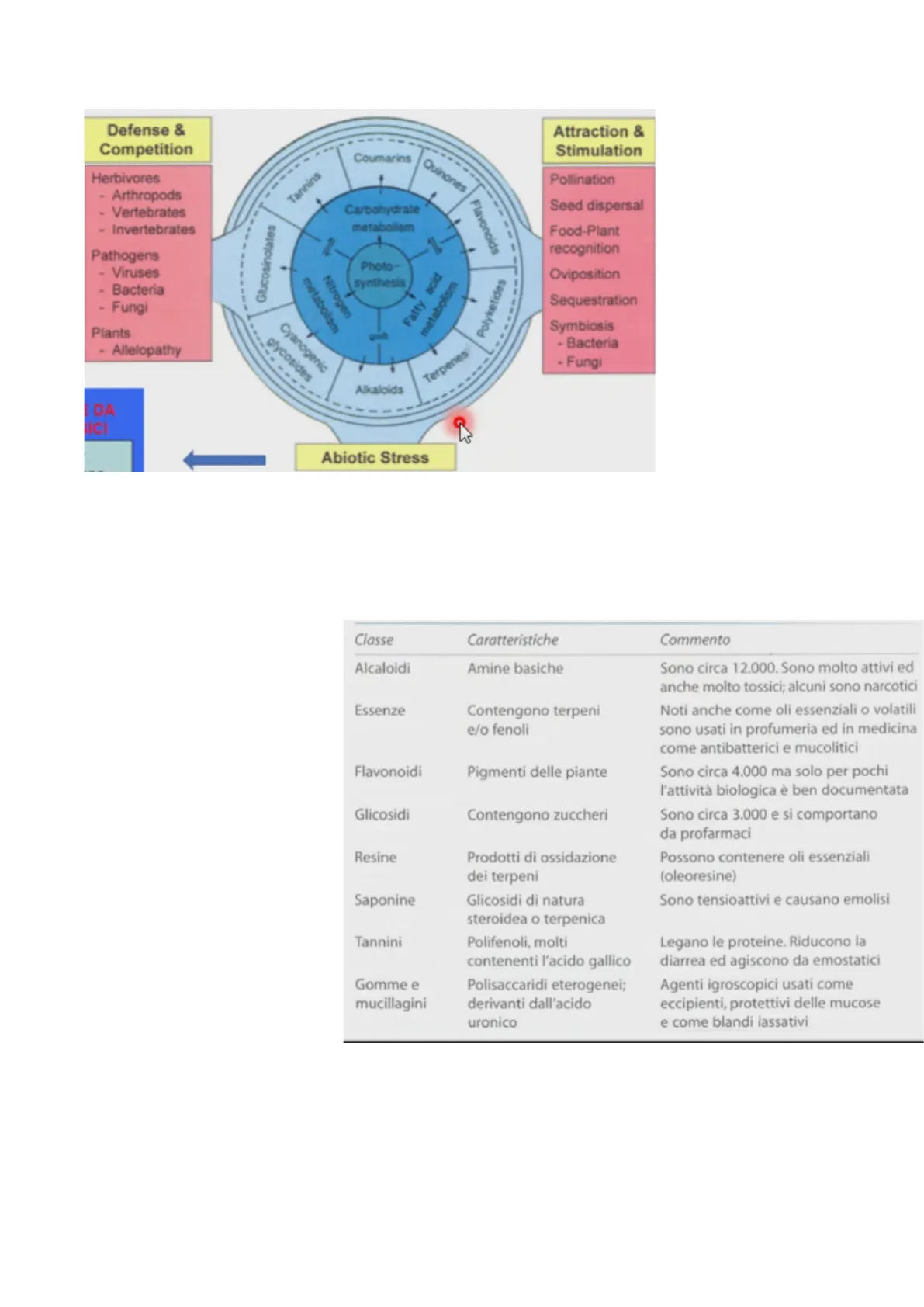 Il colore o l'aromatico del fiore spesso diventano un segnale attrattivo per l'intero impollinatore, la pianta comunica attraverso questi metaboliti. Stress abiotico: come si comporta la pianta a stimoli che non derivano da organismi viventi (UV, evaporazione, temperatura) la pianta agisce con meccanismi di difesa. Nel caso di evaporazione la pianta produce le mucillagini per prevenire l'evaporazione e la conseguente disidratazione.