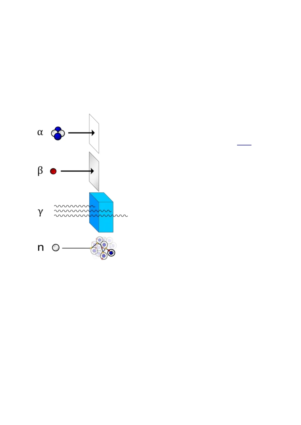 I raggi alpha (a) consistono in nuclei di elio-4 ad alta velocità, e sono fermati da un foglio di carta. I raggi beta (B), costituiti da elettroni, sono fermati da un foglio di alluminio. I raggi gamma (y), costituiti da fotoni ad alta energia sono infine assorbiti da materiali molto densi. I raggi di neutroni (n) costituiti da neutroni liberi, sono bloccati da elementi leggeri, come l'idrogeno, che li rallenta e/o li cattura.