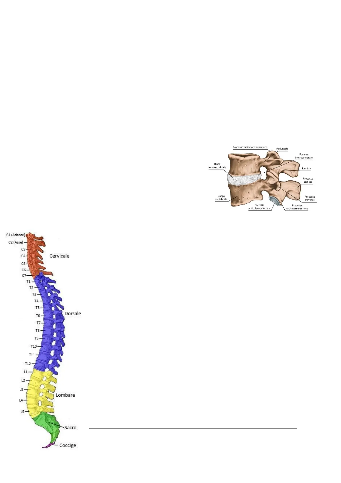 Nella colonna vertebrale abbiamo 33 vertebre divise in 5 regioni in base alla loro posizione: C1 (Atlante) C2 (Asse) C3- C4- Cervicale C5 C6- C7- T1_ T2 - T3- T4- T5- Dorsale T6 - T7 T8 T9 - T10- T11 - T12- L1- L2 13- Lombare 14- 15- ~Sacro Coccige