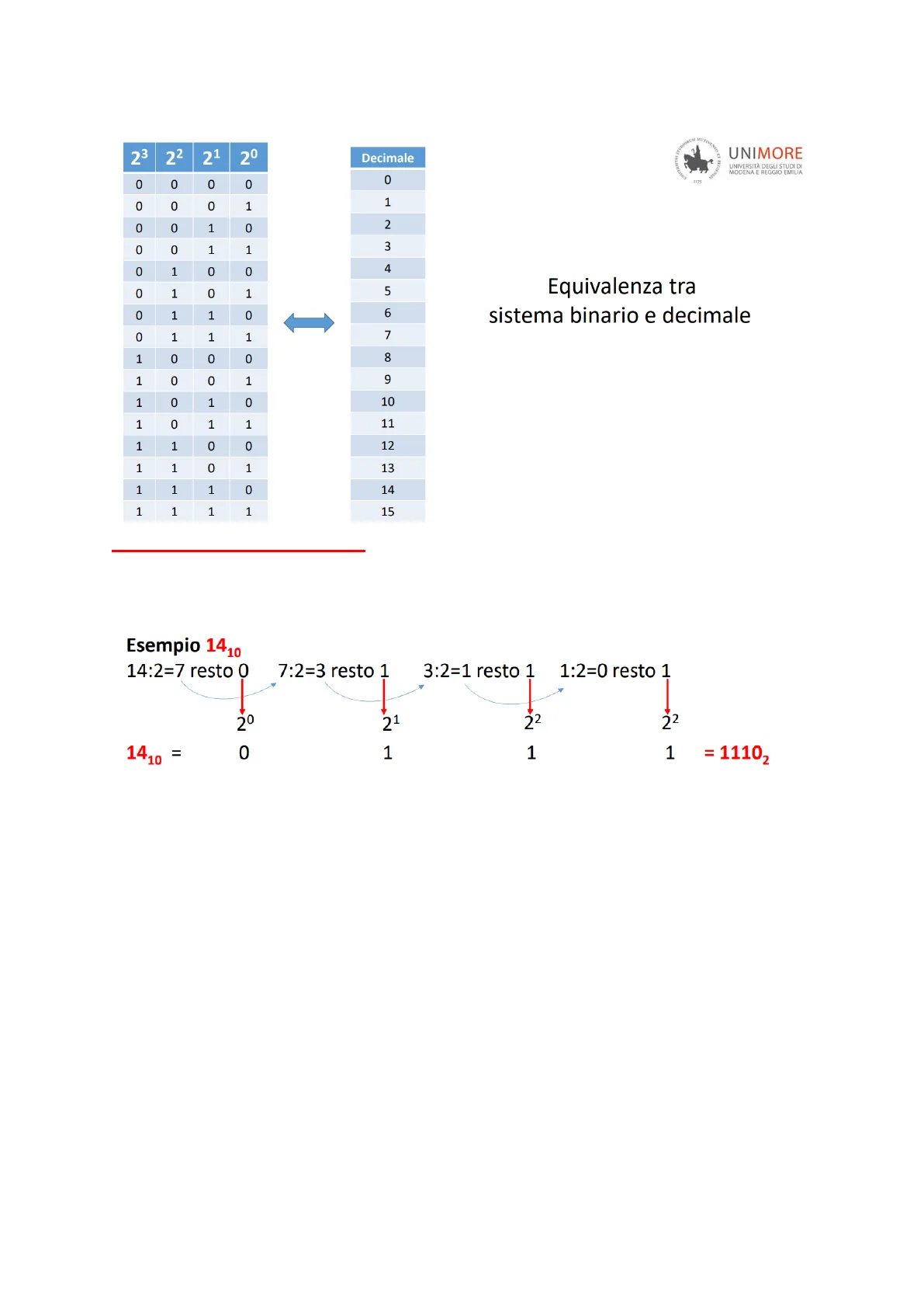 ESEMPI 0 1Esempio conversione DEC to BIN e BIN to DEC UNIMORE UNIVERSITÀ DEGLI STUDI DI MODENA E REGGIO EMILIA 14=1110=8+4+2+0