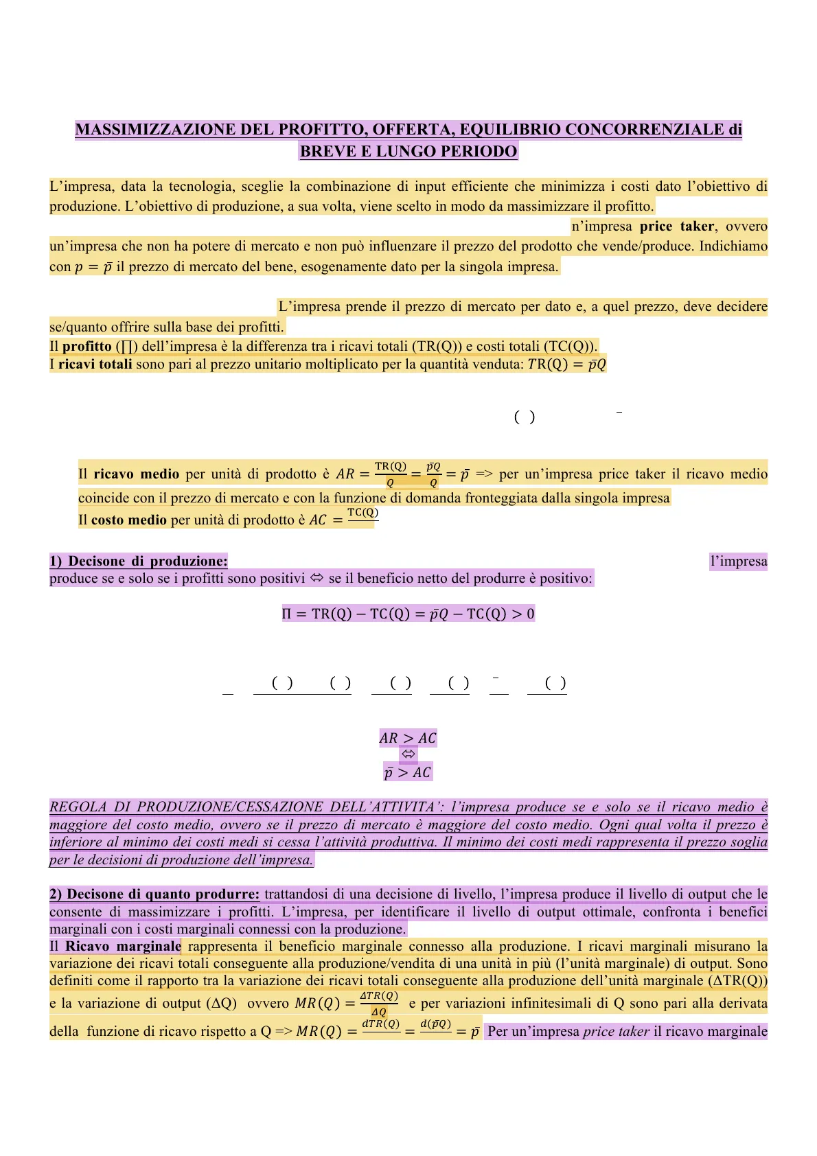 Documento da Cleam su massimizzazione del profitto, offerta, equilibrio concorrenziale di breve e lungo periodo. Il Pdf, utile per studenti universitari di Economia, analizza le decisioni di produzione delle imprese price taker, il calcolo dei ricavi e costi marginali, e le condizioni di equilibrio, includendo il surplus del produttore.
