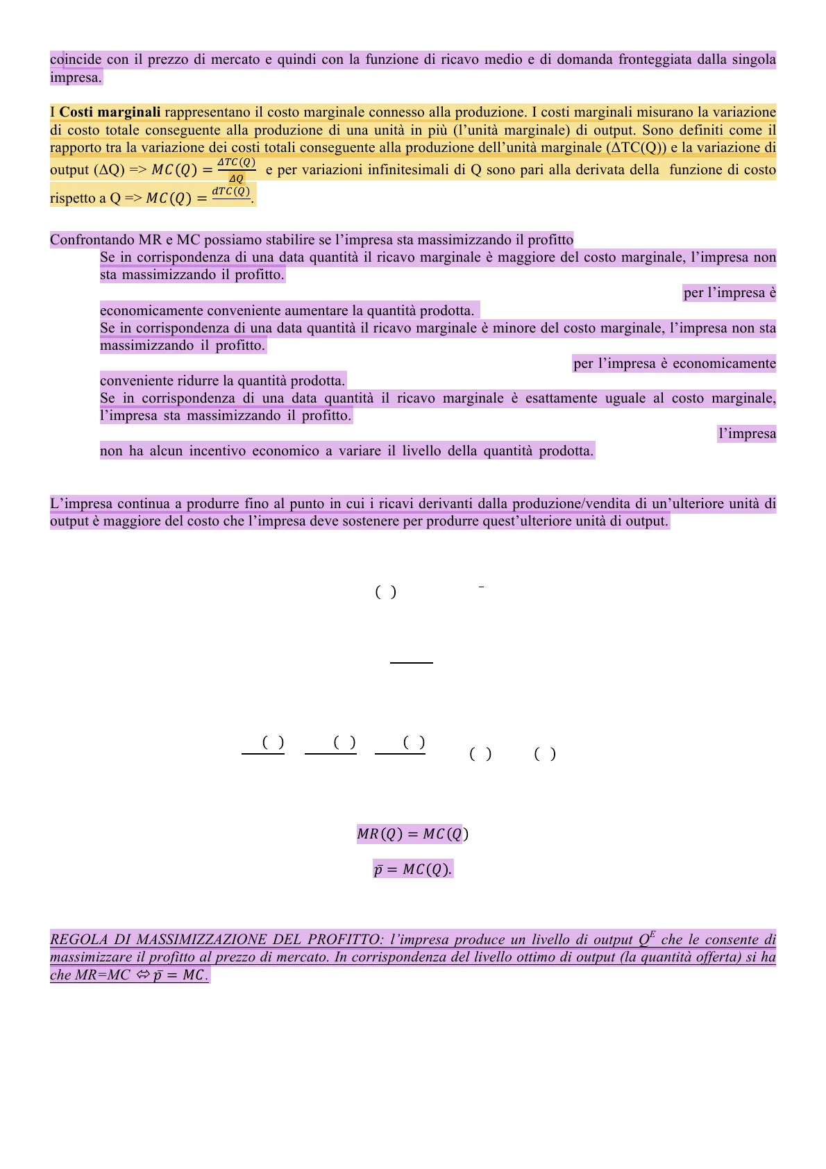 2) Decisone di quanto produrre: trattandosi di una decisione di livello, l'impresa produce il livello di output che le consente di massimizzare i profitti. L'impresa, per identificare il livello di output ottimale, confronta i benefici marginali con i costi marginali connessi con la produzione. Il Ricavo marginale rappresenta il beneficio marginale connesso alla produzione. I ricavi marginali misurano la variazione dei ricavi totali conseguente alla produzione/vendita di una unità in più (l'unità marginale) di output. Sono definiti come il rapporto tra la variazione dei ricavi totali conseguente alla produzione dell'unità marginale (ATR(Q)) e la variazione di output (AQ) ovvero MR(Q) = ATR(Q) 40 e per variazioni infinitesimali di Q sono pari alla derivata della funzione di ricavo rispetto a Q => MR(Q) = dTR(Q)- = dQ dQ d(pe) = p. Per un'impresa price taker il ricavo marginale 1coincide con il prezzo di mercato e quindi con la funzione di ricavo medio e di domanda fronteggiata dalla singola impresa. I Costi marginali rappresentano il costo marginale connesso alla produzione. I costi marginali misurano la variazione di costo totale conseguente alla produzione di una unità in più (l'unità marginale) di output. Sono definiti come il rapporto tra la variazione dei costi totali conseguente alla produzione dell'unità marginale (ATC(Q)) e la variazione di output (AQ) => MC(Q) = ATC(Q) rispetto a Q => MC (Q) = dTC(Q) e per variazioni infinitesimali di Q sono pari alla derivata della funzione di costo dQ . Confrontando MR e MC possiamo stabilire se l'impresa sta massimizzando il profitto. In particolare:
