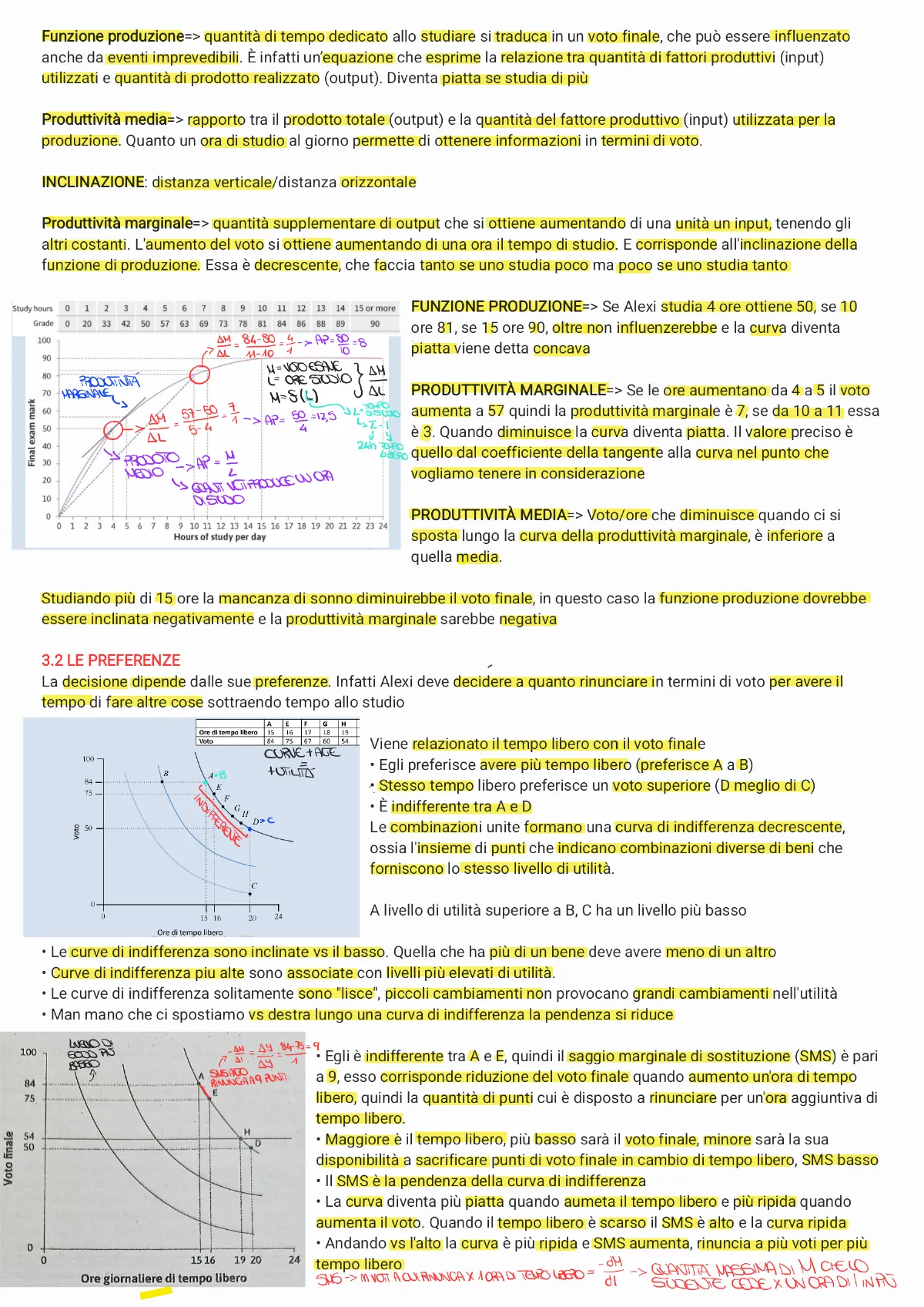 Produttività marginale=> quantità supplementare di output che si ottiene aumentando di una unità un input, tenendo gli altri costanti. L'aumento del voto si ottiene aumentando di una ora il tempo di studio. E corrisponde all'inclinazione della funzione di produzione. Essa è decrescente, che faccia tanto se uno studia poco ma poco se uno studia tanto