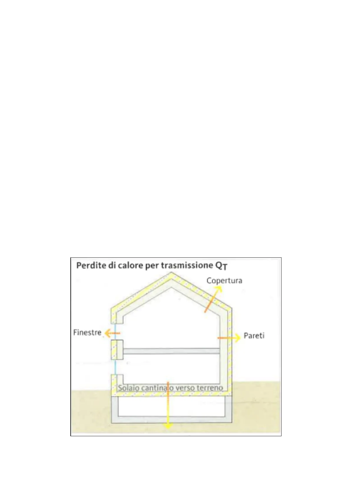 Perdite di trasmissione QT: il calore viene trasmesso attraverso gli elementi dell'involucro, sia opachi che trasparenti, passando dalle stanze riscaldate a temperatura più alta a quelle non riscaldate, all'esterno o al terreno. L'entità di queste perdite di calore dipende, oltre che dai parametri climatici (differenza di temperatura interno-esterno nei giorni di riscaldamento):
