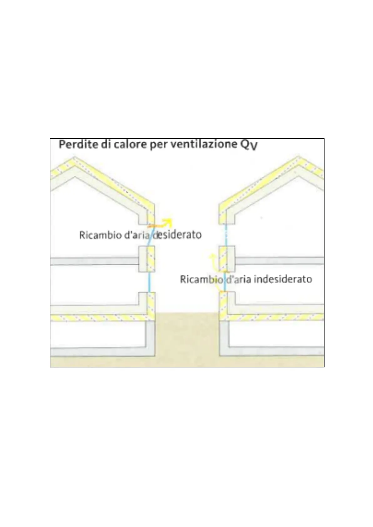 Il calore viene disperso all'esterno attraverso i ricambi termici d'aria necessari per motivi igienici e gli spifferi o fessure nelle costruzioni. I ricambi d'aria, che avvengono mediante la semplice apertura delle finestre, portano all'interno aria fredda che dovrà essere riscaldata aumentando così il fabbisogno energetico dell'edificio. Una strategia per ridurre le perdite di ventilazione è un sistema di ventilazione controllata con recupero di calore. Questo sistema recupera parte del calore dell'aria in uscita e lo cede all'aria in ingresso che necessità quindi di meno energia per essere portata alla temperatura di 20 °C.