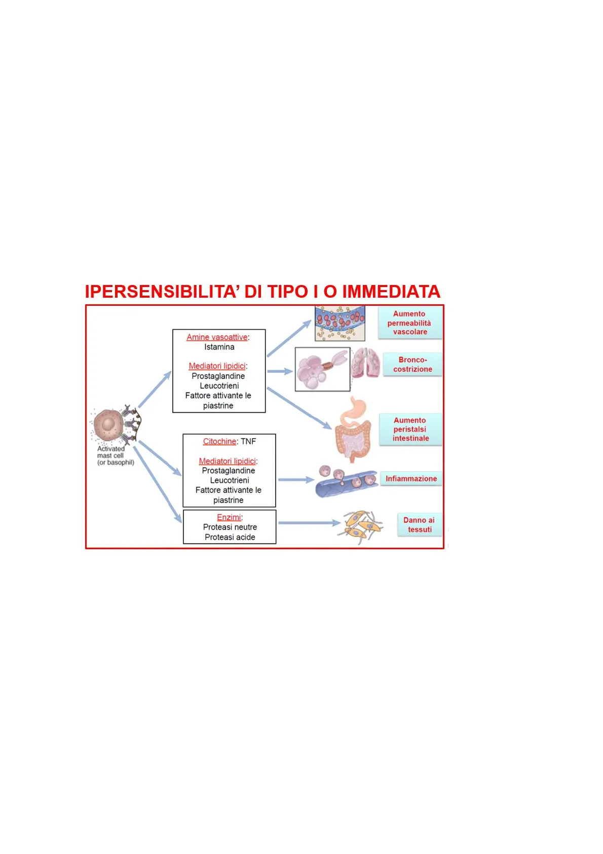 TIPO I: Necessaria la fase di sensibilazzione: avviene pochi minuti dopo la prima esposizione. In seguito al primo contatto le IgE si legano ai recettori FC presenti nei mastociti, presenti prevalentemente negli epiteli, connettivo e mucose, sensibilizzandoli. La seconda esposizione induce l'aggregazione delle IgE presenti sulla membrana dei mastociti, inducendone la degranulazione. I mediatori così rilasciati agiscono nei tessuti circostanti. IPERSENSIBILITA' DI TIPO I O IMMEDIATA Aumento permeabilità vascolare Amine vasoattive: Istamina Bronco- costrizione Mediatori lipidici: Prostaglandine Leucotrieni Fattore attivante le piastrine Aumento peristalsi intestinale Citochine: TNF Activated mast cell (or basophil) Mediatori lipidici: Prostaglandine Leucotrieni Fattore attivante le piastrine Infiammazione Enzimi: Proteasi neutre Proteasi acide Danno ai tessuti La reazione peggiore è l'anafilassi: attivazione sistemica di mastociti che rilasciano una grande quantità di mediatori chimici. Il trattamento d'elezione è la somministrazione di adrenalina che inibisce l'attività dei mastociti, il rilascio dei suoi mediatori, la broncocostrizione, la vasodilatazione e la conseguente formazione d'edema. I farmaci maggiormente coinvolti sono: penicillina, anestetici locali e FANS.