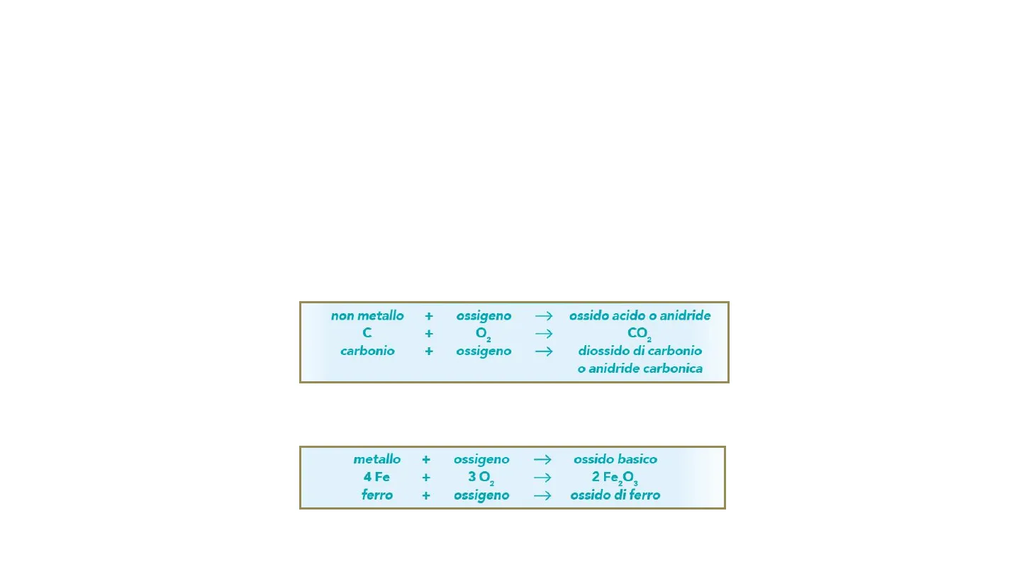 La reazione di ossidazione tra un metallo e l'ossigeno da origine a ossidi basici o semplicemente ossidi: + ossigeno 302 -> ossido basico metallo 4 Fe + ferro + ossigeno 2 Fe,O3 ossido di ferro