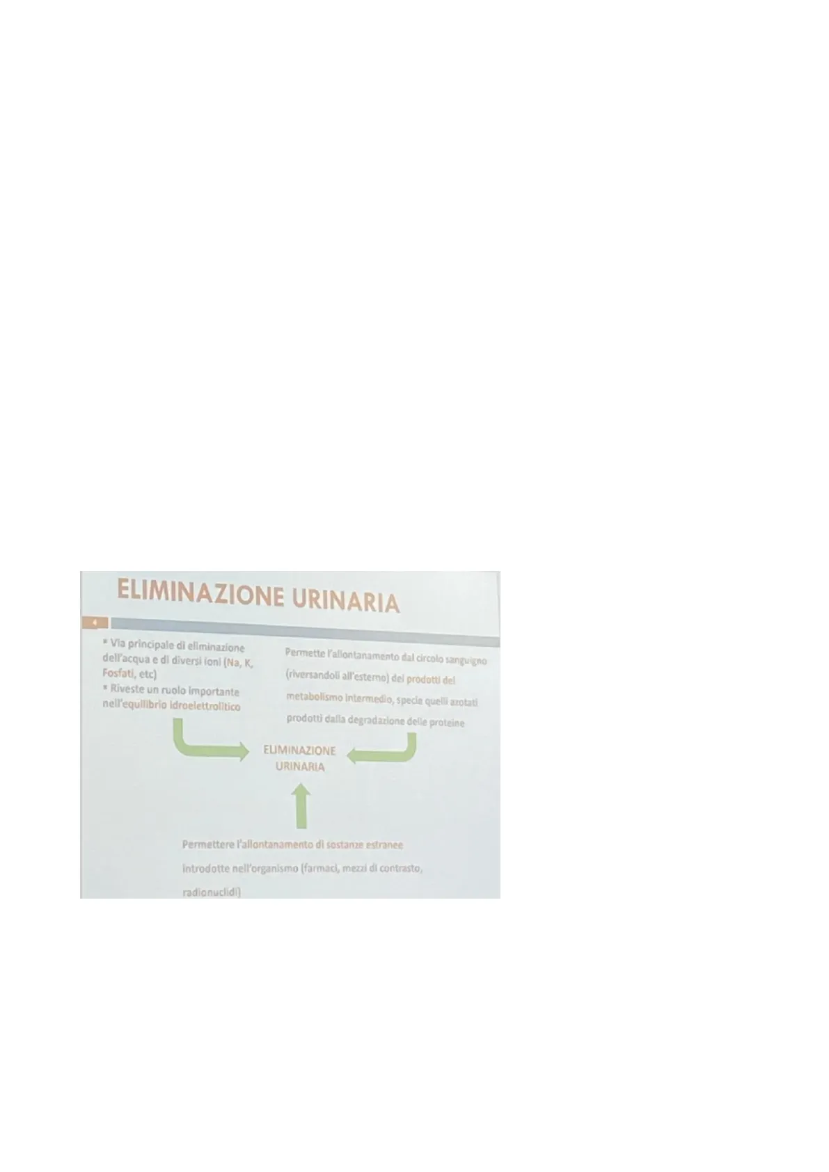 metabolismo intermedio, specie quelli azotati prodotti dalla degradazione delle proteine ELIMINAZIONE URINARIA Permettere l'allontanamento di sostanze estranee Introdotte nell'organismo (farmaci, mezzi di contrasto, radionuclidi) L'apparato urinario elimina anche alcuni farmaci che, metabolizzati a livello renale o epatico, tendono ad essere escreti con le urine.S