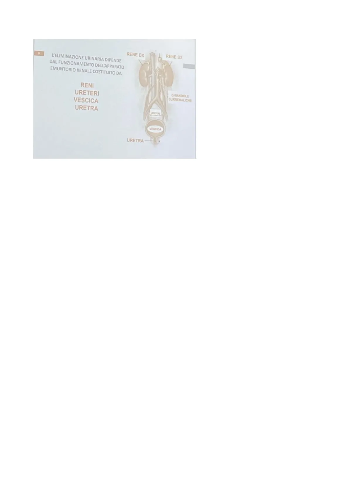 RENE DX RENE SX L'ELIMINAZIONE URINARIA DIPENDE DAL FUNZIONAMENTO DELL'APPARATO EMUNTORIO RENALE COSTITUITO DA RENI URETERI VESCICA URETRA GHIANDOLE SURRENALICHE VESCICA URETRAAnatomicamente, l'apparato urinario si differenzia nell'uomo e nella donna in base all'uretra. L'uretra maschile è più lunga, di circa 12 cm, ed è meno soggetta a infezioni rispetto a quella femminile, che è più corta, di circa 4 cm, e quindi più soggetta a infezioni; di pari, l'uomo presenta la prostata che tende ad infiammarsi ed è soggetta ad infezioni.