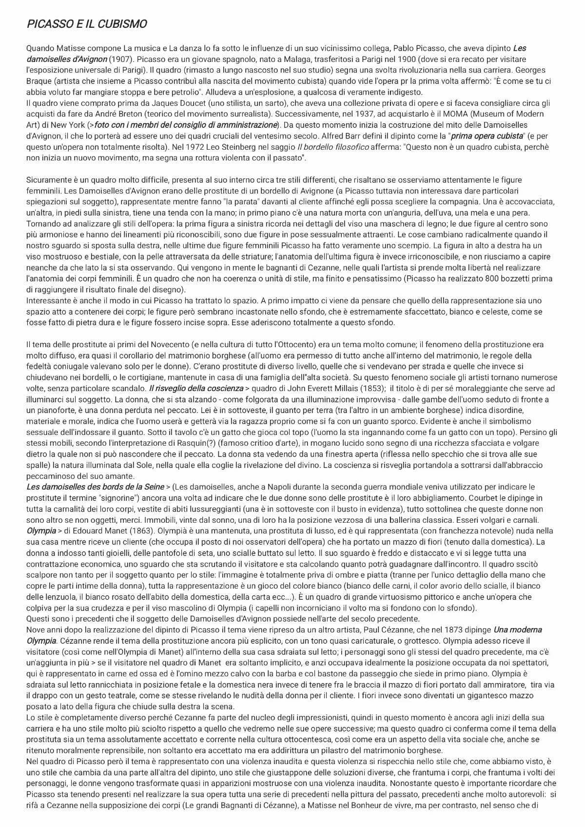 Documento su Picasso e il Cubismo, analizzando "Les Demoiselles d'Avignon". Il Pdf, di livello universitario e incentrato sull'Arte, esplora il primitivismo, la rappresentazione femminile e l'evoluzione del Cubismo, con un linguaggio accademico e immagini di supporto.