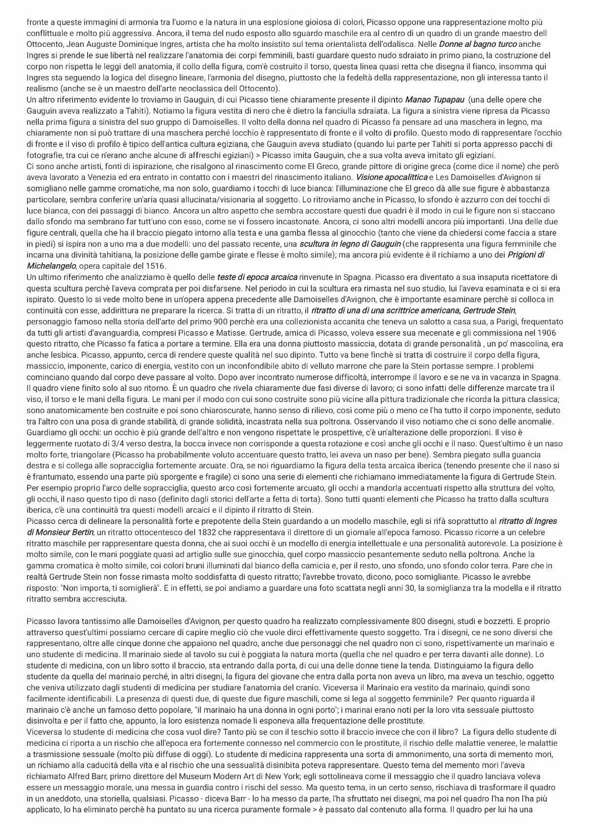 Nel quadro di Picasso però il tema è rappresentato con una violenza inaudita e questa violenza si rispecchia nello stile che, come abbiamo visto, è uno stile che cambia da una parte all'altra del dipinto, uno stile che giustappone delle soluzioni diverse, che frantuma i corpi, che frantuma i volti dei personaggi, le donne vengono trasformate quasi in apparizioni mostruose con una violenza inaudita. Nonostante questo è importante ricordare che Picasso sta tenendo presenti nel realizzare la sua opera tutta una serie di precedenti nella pittura del passato, precedenti anche molto autorevoli: si rifà a Cezanne nella supposizione dei corpi (Le grandi Bagnanti di Cézanne), a Matisse nel Bonheur de vivre, ma per contrasto, nel senso che difronte a queste immagini di armonia tra l'uomo e la natura in una esplosione gioiosa di colori, Picasso oppone una rappresentazione molto più conflittuale e molto più aggressiva. Ancora, il tema del nudo esposto allo sguardo maschile era al centro di un quadro di un grande maestro dell Ottocento, Jean Auguste Dominique Ingres, artista che ha molto insistito sul tema orientalista dell'odalisca. Nelle Donne al bagno turco anche Ingres si prende le sue libertà nel realizzare l'anatomia dei corpi femminili, basti guardare questo nudo sdraiato in primo piano, la costruzione del corpo non rispetta le leggi dell anatomia, il collo della figura, com'è costruito il torso, questa linea quasi retta che disegna il fianco, insomma qui Ingres sta seguendo la logica del disegno lineare, l'armonia del disegno, piuttosto che la fedeltà della rappresentazione, non gli interessa tanto il realismo (anche se è un maestro dell'arte neoclassica dell Ottocento).