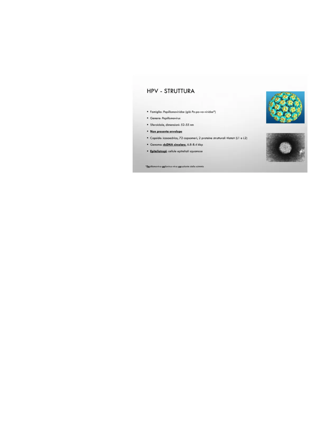 "Papillomavirus-paliovirus-virus vacuolante della scimmia Le sue caratteristiche strutturali sono: - Ha una forma sferoidale; - Le sue dimensioni sono ridotte (52-55 nm) e influenzano anche quelle del genoma; - È un virus nudo, ovvero non presenta envelope, pertanto il capside è a diretto contatto con l'ambiente esterno; - Il capside ha una forma icosaedrica, formato da 72 capsomeri costituiti da 2 proteine strutturali: L1 e L2 (in cui L sta per "late"). Il fatto che siano solo 2 rende conto della semplicità del virus; - È epiteliotropo, ovvero ha come bersaglio le cellule degli epiteli squamosi stratificati cheratinizzati (cute) e non cheratinizzati (mucose della bocca, vie aeree superiori, zone genitali e canale anale) oppure anche epiteli semplici (monostratificati). La scelta della mucosa o della componente epiteliale dipende dal diverso tipo di genoma presente nei diversi tipi di HPV. La maggior parte dei virus possiedono un genoma che attacca gli epiteli. Si riconoscono 16 genomi differenti di virus e 160 genotipi. - È specie-specifico. Per identificare a livello clinico il tipo specifico di HPV, si procede con un'analisi della tipizzazione genomica (in particolar modo si ricercano i geni L1,E6 ed E7) e se si nota che l'omologia è del 90% , allora faranno parte dello stesso tipo; saranno dello stesso sottotipo se l'omologia è compresa fra il 90 e 100%.