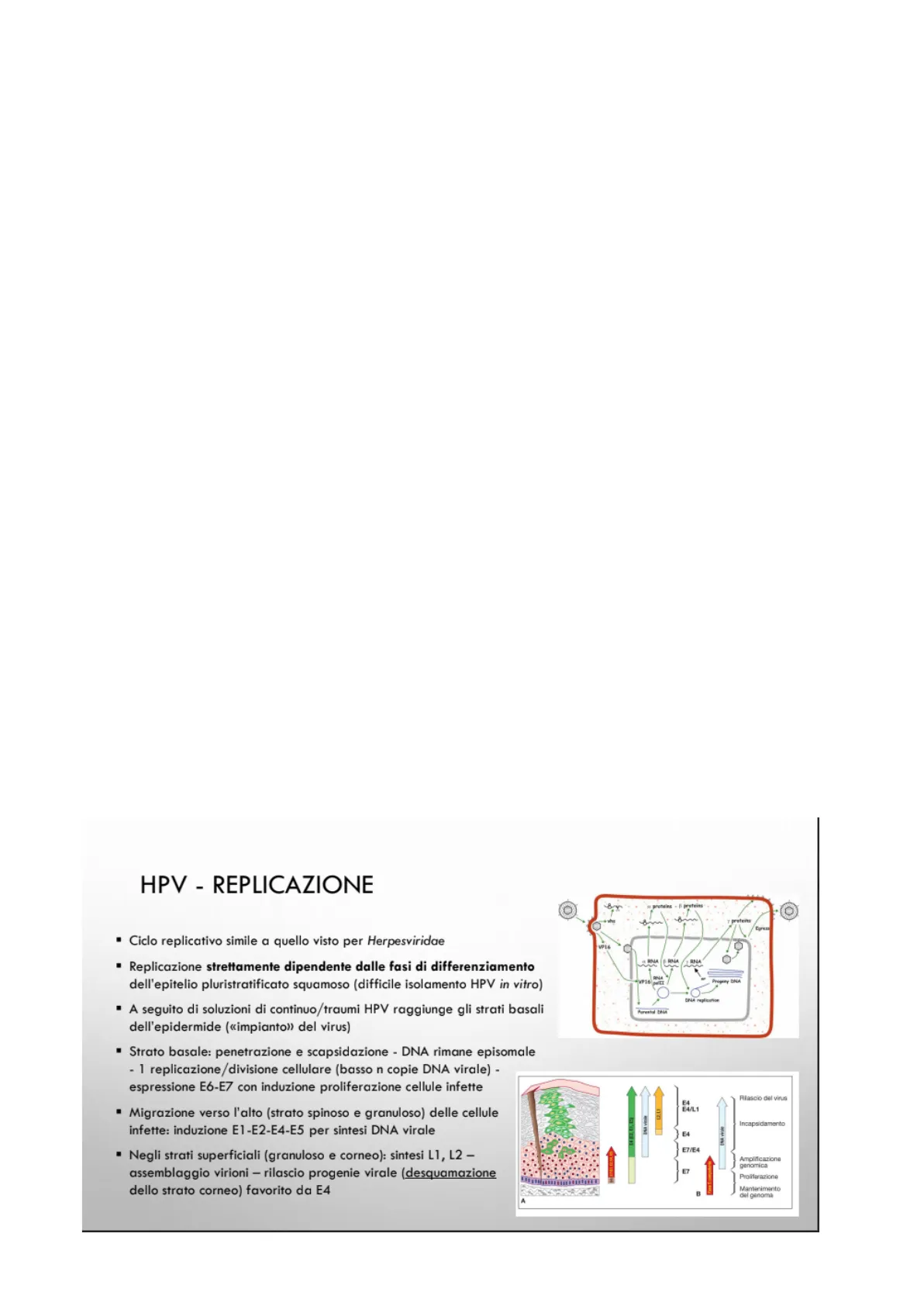 1 I geni early sono i seguenti: - E1: si occupano di replicazione del DNA virale mantenendolo in forma episomale (forma libera nel citoplasma) - E2: regola la trascrizione del DNA virale, inibisce il promotore di E6/E7. L'inibizione del promotore: questo accade quando abbiamo il processo di integrazione del virus virale in quello della cellula ospite, che avviene proprio nelle regioni in corrispondenza del gene E2. L'infezione da HPV sfocia nell' insorgenza della patologia solo quando il DNA virale si lega al DNA della cellula ospite. L'obiettivo a livello clinico è capire è avvenuto appunto l'integrazione. L'attivazione di E6 e E7 determina la patologia in quanto porta alla produzione di proteine coinvolte nel processo di oncogenesi. - E3, E8: funzione ignota, non conservati in tutti i genotipi HPV - E4: espressa tardivamente, si associa al citoscheletro di cheratina, facendolo collassare e facilitando la liberazione della progenie virale, permette una maggiore diffusione del virus nelle cellule che sono state infettate. Questo determina uno spread della diffusione virale, partecipa nelle fasi finali del processo replicativo. - E5, E6, E7: coinvolte nella trasformazione neoplastica cellulare. Fra il gene E5 e L2 ci sono delle catene di poli A che sono coinvolte nei processi di regolazione della replicazione del virus stesso. I geni late codificano per proteine L, componenti il capside virale: - proteina L1: proteina capsidica maggiore (90% peso secco capside) - proteina L2: proteina capsidica minore