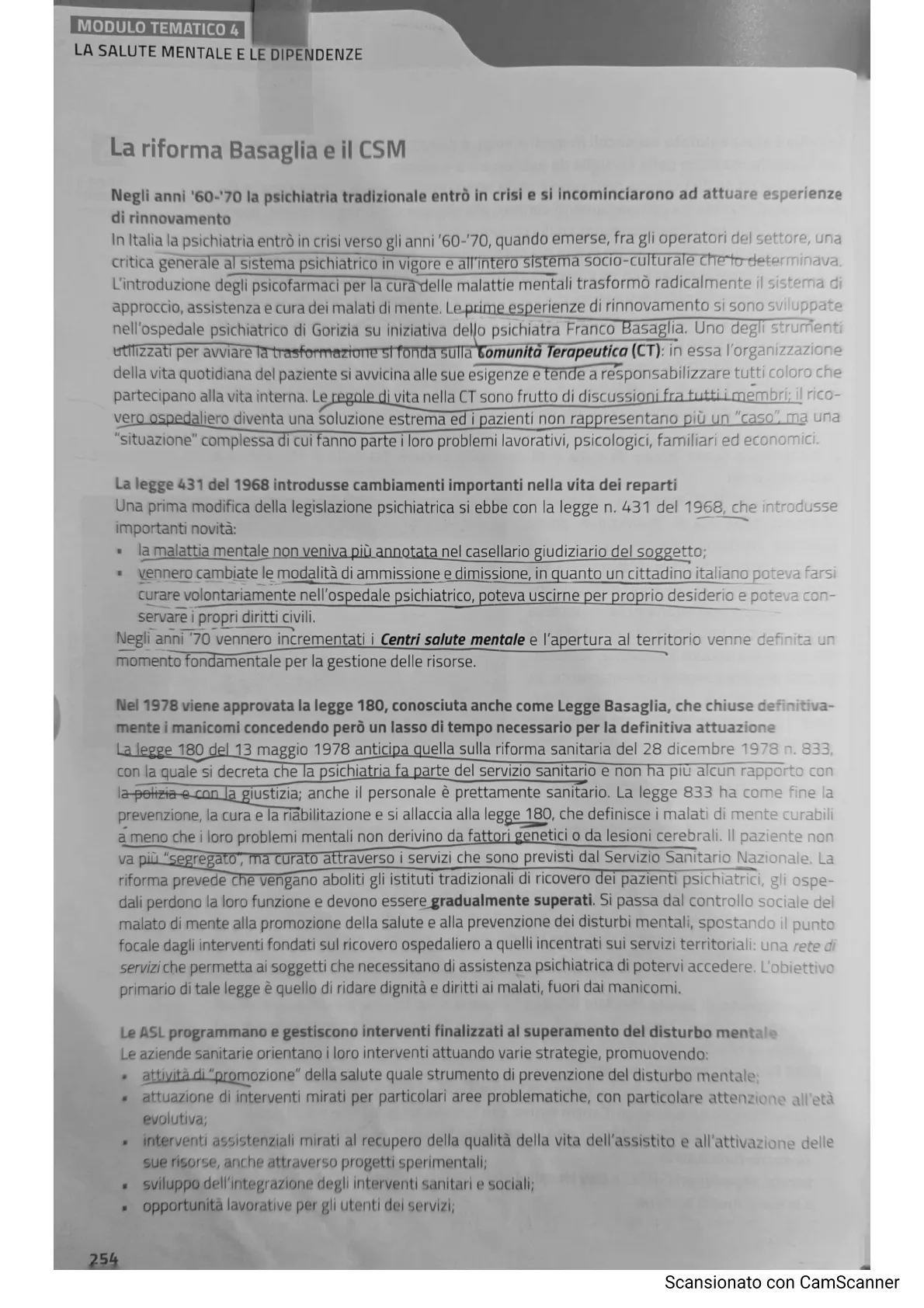 Nel 1978 viene approvata la legge 180, conosciuta anche come Legge Basaglia, che chiuse definitiva- mente i manicomi concedendo però un lasso di tempo necessario per la definitiva attuazione La legge 180 del 13 maggio 1978 anticipa quella sulla riforma sanitaria del 28 dicembre 1978 n. 833, con la quale si decreta che la psichiatria fa parte del servizio sanitario e non ha più alcun rapporto con la polizia e con la giustizia; anche il personale è prettamente sanitario. La legge 833 ha come fine la prevenzione, la cura e la riabilitazione e si allaccia alla legge 180, che definisce i malati di mente curabili a meno che i loro problemi mentali non derivino da fattori genetici o da lesioni cerebrali. Il paziente non va più "segregato", ma curato attraverso i servizi che sono previsti dal Servizio Sanitario Nazionale. La riforma prevede che vengano aboliti gli istituti tradizionali di ricovero dei pazienti psichiatrici, gli ospe- dali perdono la loro funzione e devono essere gradualmente superati. Si passa dal controllo sociale del malato di mente alla promozione della salute e alla prevenzione dei disturbi mentali, spostando il punto focale dagli interventi fondati sul ricovero ospedaliero a quelli incentrati sui servizi territoriali: una rete di servizi che permetta ai soggetti che necessitano di assistenza psichiatrica di potervi accedere. L'obiettivo primario di tale legge è quello di ridare dignità e diritti ai malati, fuori dai manicomi.