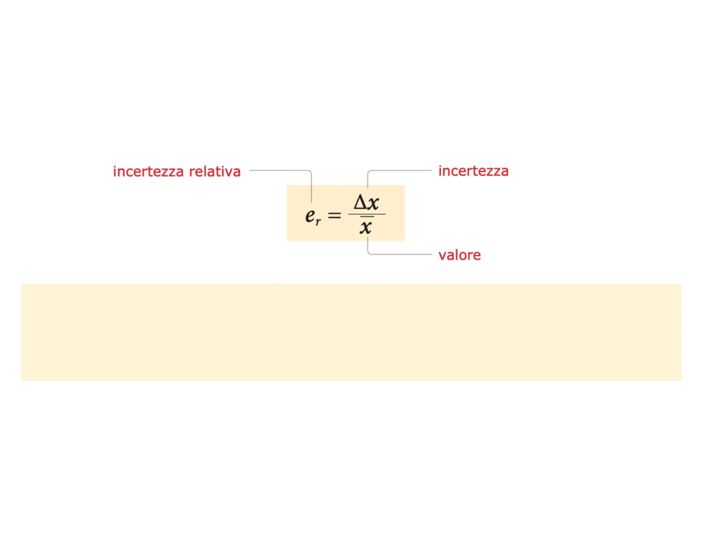 Si chiama incertezza relativa (er) di una misura il rapporto tra l'incertezza e il valore della misura: incertezza relativa incertezza er = Ax x valore L'incertezza relativa è un indice della precisione della misura: una misura è più precisa se la sua incertezza relativa è molto più piccola del valore della grandezza. Nella formula per er, il valore x e l'incertezza Ax hanno le stesse unità di misura: l'incertezza relativa è un numero puro.