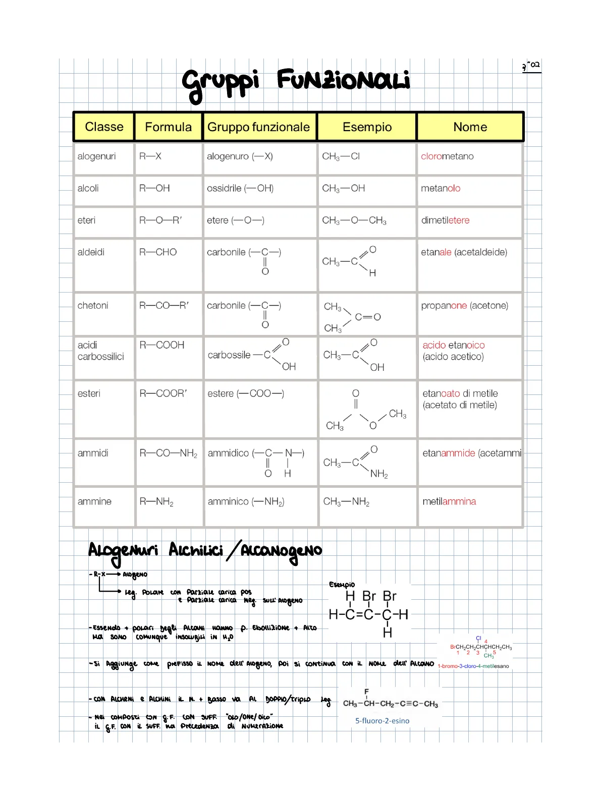 Classe Formula Gruppo funzionale Esempio Nome alogenuri R-X alogenuro (-X) CH3-CI clorometano alcoli R-OH ossidrile (-OH) CH3-OH metanolo eteri R-O-R' etere (-0-) CH3-0-CH3 dimetiletere aldeidi R-CHO carbonile (-C-) CH3-C=0 `H etanale (acetaldeide) chetoni R-CO-R' carbonile (-C-) II Ő CH3 C=0 propanone (acetone) CH3 acidi carbossilici R-COOH carbossile -c" OH C CH3-C=0 OH acido etanoico (acido acetico) esteri R-COOR' estere (-COO-) C CH3 CH3 O etanoato di metile (acetato di metile) ammidi R-CO-NH2 ammidico (-C-N-) OH CH3-C? NH2 etanammide (acetammi ammine R-NH2 amminico (-NH2) CH3-NH2 metilammina