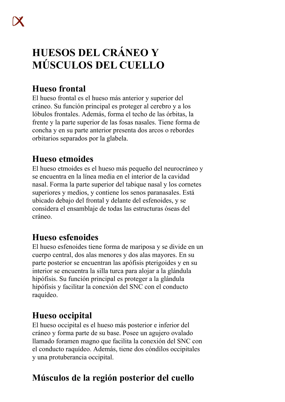 El cráneo se divide en neurocráneo y viscerocráneo. El neurocráneo está formado por la bóveda y la base, y cuenta con ocho huesos pares e impares. El viscerocráneo está compuesto por huesos más ligeros. El esfenoides es un hueso importante del neurocráneo, ya que forma parte de la base del cráneo y tiene varios agujeros y crestas. El etmoides es otro hueso importante, ya que forma parte de la bóveda del cráneo y tiene varias caras y masas laterales.