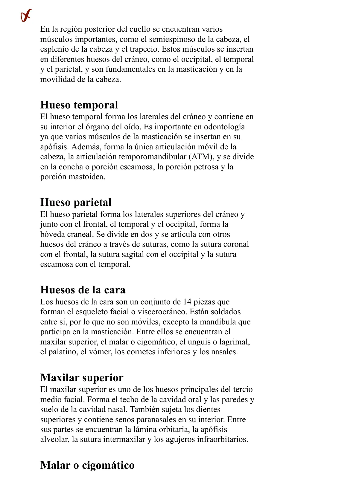 Los huesos de la cara son los huesos que forman la estructura ósea de la cara. Estos huesos incluyen los huesos palatinos, maxilares superiores, vómer y mandíbula o maxilar inferior. Los huesos palatinos y maxilares superiores forman el paladar duro, mientras que el vómer forma parte del tabique de las fosas nasales. La mandíbula es el único hueso móvil de la cabeza y es de gran importancia en odontología.