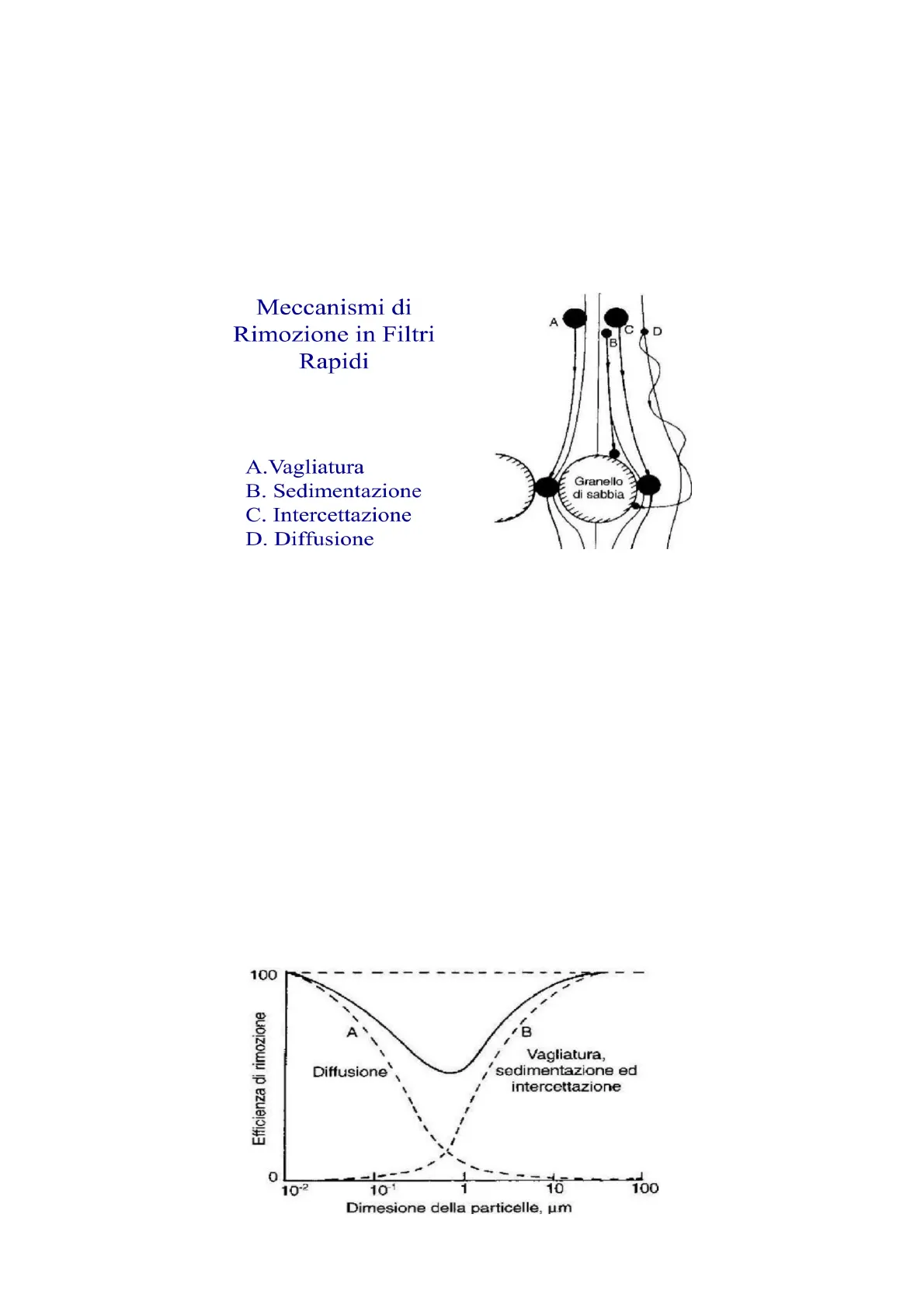 Supponiamo di avere nell'acqua da filtrare particelle di diverse dimensioni. Il letto filtrante è costituito da tanti granelli con un certo diametro e dagli interspazi tra i granelli. Vagliatura: la particella A trascinata dai filetti fluidi che trasportano l'acqua viene bloccata in quanto il suo diametro è maggiore rispetto all'interspazio fra due granelli adiacenti.