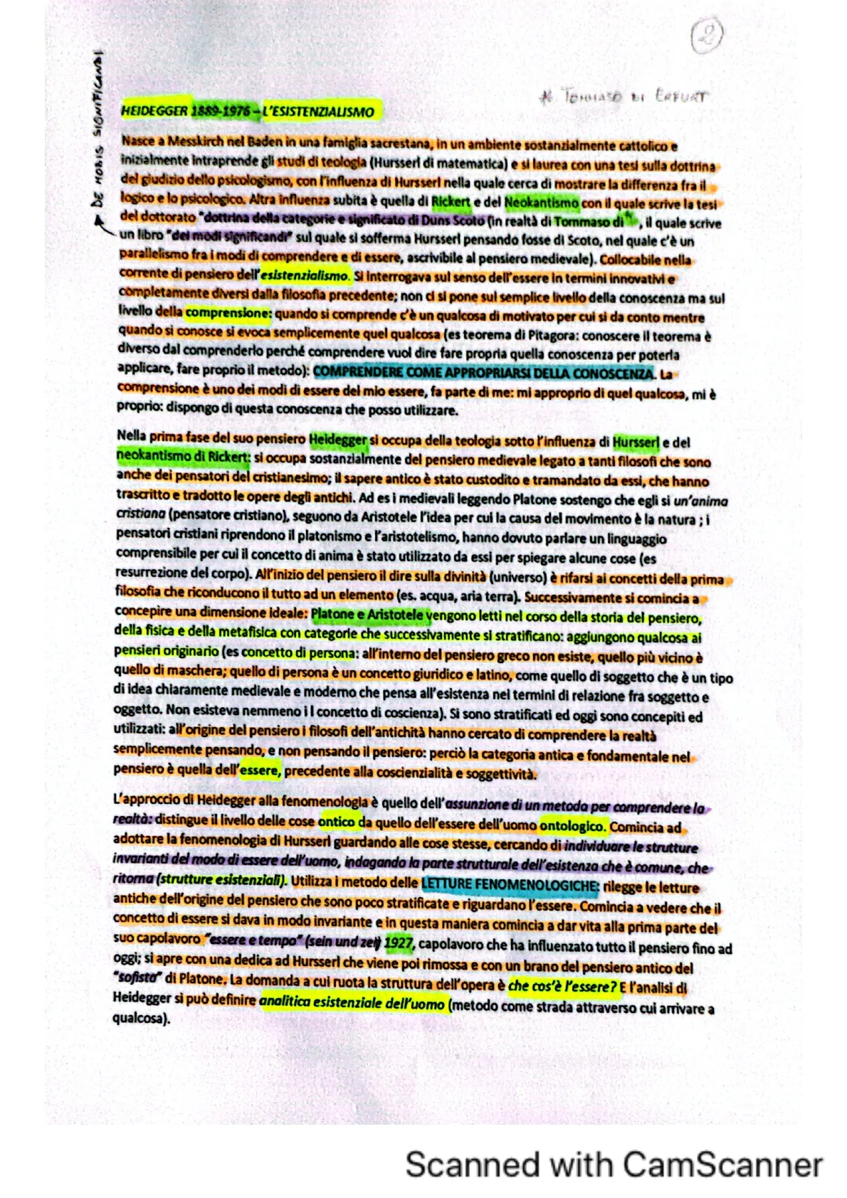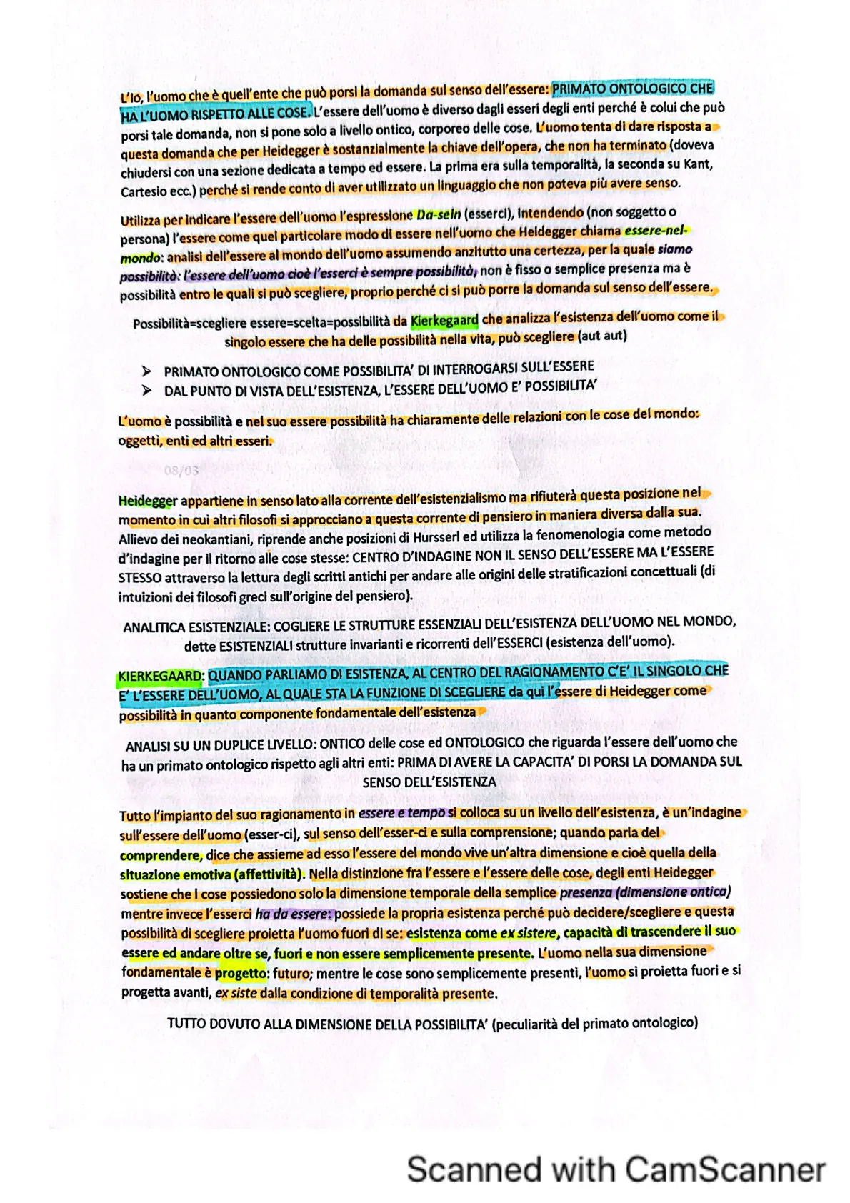 Scanned with CamScannerL'lo, l'uomo che è quell'ente che può porsi la domanda sul senso dell'essere: PRIMATO ONTOLOGICO CHE HA L'UOMO RISPETTO ALLE COSE. L'essere dell'uomo è diverso dagli esseri degli enti perché è colui che può porsi tale domanda, non si pone solo a livello ontico, corporeo delle cose. L'uomo tenta di dare risposta a questa domanda che per Heidegger è sostanzialmente la chiave dell'opera, che non ha terminato (doveva chiudersi con una sezione dedicata a tempo ed essere. La prima era sulla temporalità, la seconda su Kant, Cartesio ecc.) perché si rende conto di aver utilizzato un linguaggio che non poteva più avere senso. Utilizza per indicare l'essere dell'uomo l'espressione Da-sein (esserci), Intendendo (non soggetto o persona) l'essere come quel particolare modo di essere nell'uomo che Heidegger chiama essere-nel- mondo: analisi dell'essere al mondo dell'uomo assumendo anzitutto una certezza, per la quale siamo possibilità: l'essere dell'uomo cioè l'esserci è sempre possibilità, non è fisso o semplice presenza ma è possibilità entro le quali si può scegliere, proprio perché ci si può porre la domanda sul senso dell'essere. Possibilità=scegliere essere=scelta=possibilità da Kierkegaard che analizza l'esistenza dell'uomo come il singolo essere che ha delle possibilità nella vita, può scegliere (aut aut)