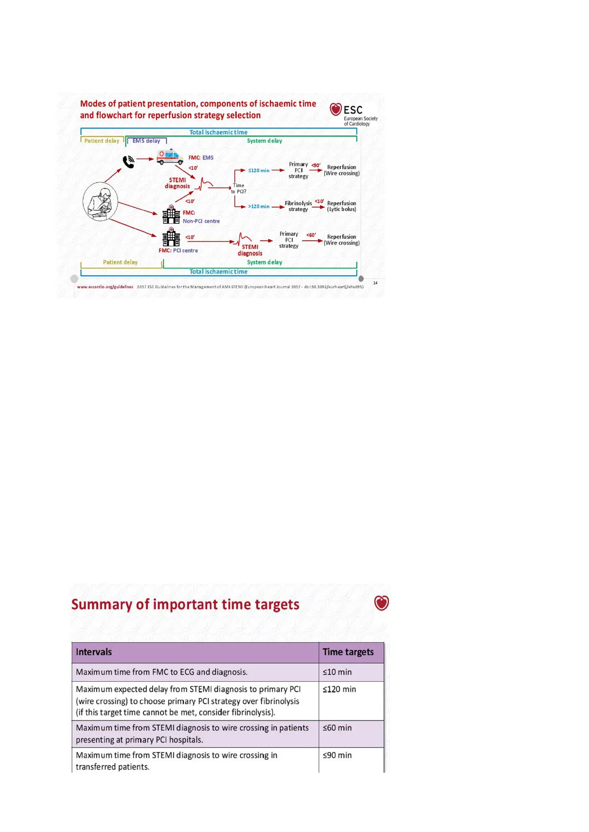Intervals Time targets Maximum time from FMC to ECG and diagnosis. ≤10 min Maximum expected delay from STEMI diagnosis to primary PCI (wire crossing) to choose primary PCI strategy over fibrinolysis (if this target time cannot be met, consider fibrinolysis). ≤120 min Maximum time from STEMI diagnosis to wire crossing in patients presenting at primary PCI hospitals. ≤60 min Maximum time from STEMI diagnosis to wire crossing in transferred patients. ≤90 min Total ischaemic timeTerapia riperfusiva nello STEMI