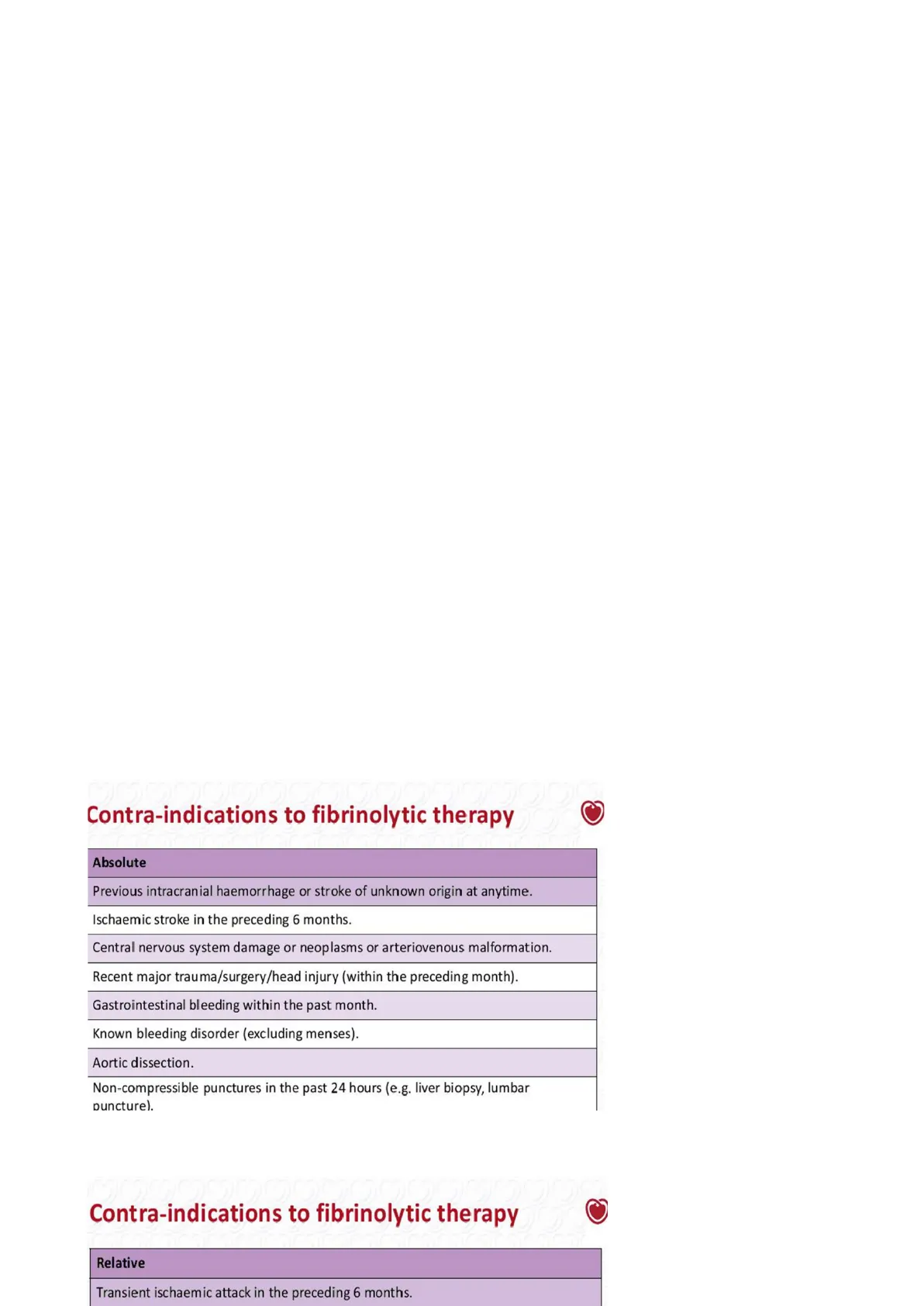 Absolute Previous intracranial haemorrhage or stroke of unknown origin at anytime. Ischaemic stroke in the preceding 6 months. Central nervous system damage or neoplasms or arteriovenous malformation. Recent major trauma/surgery/head injury (within the preceding month). Gastrointestinal bleeding within the past month. Known bleeding disorder (excluding menses). Aortic dissection. Non-compressible punctures in the past 24 hours (e.g. liver biopsy, lumbar puncture).