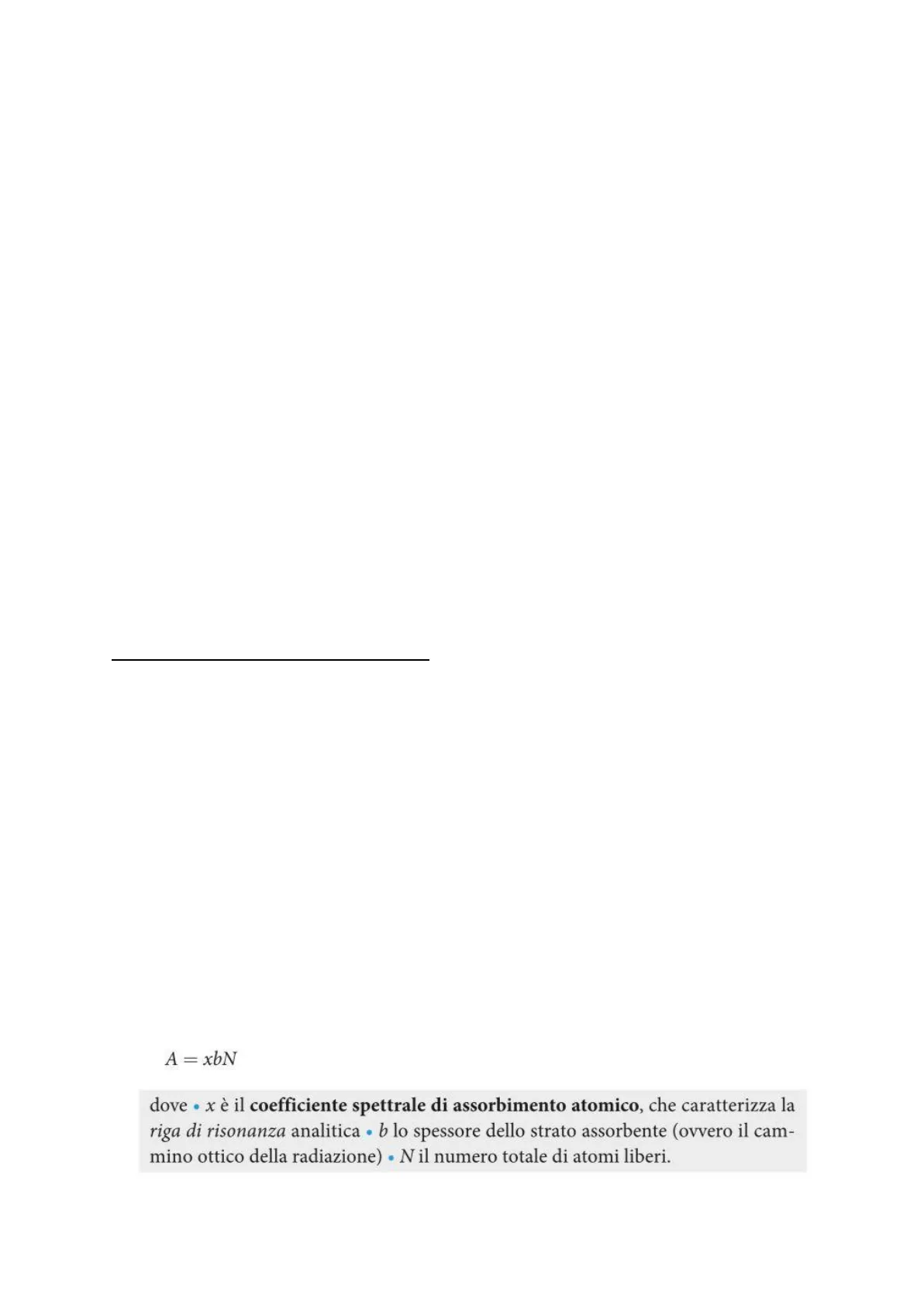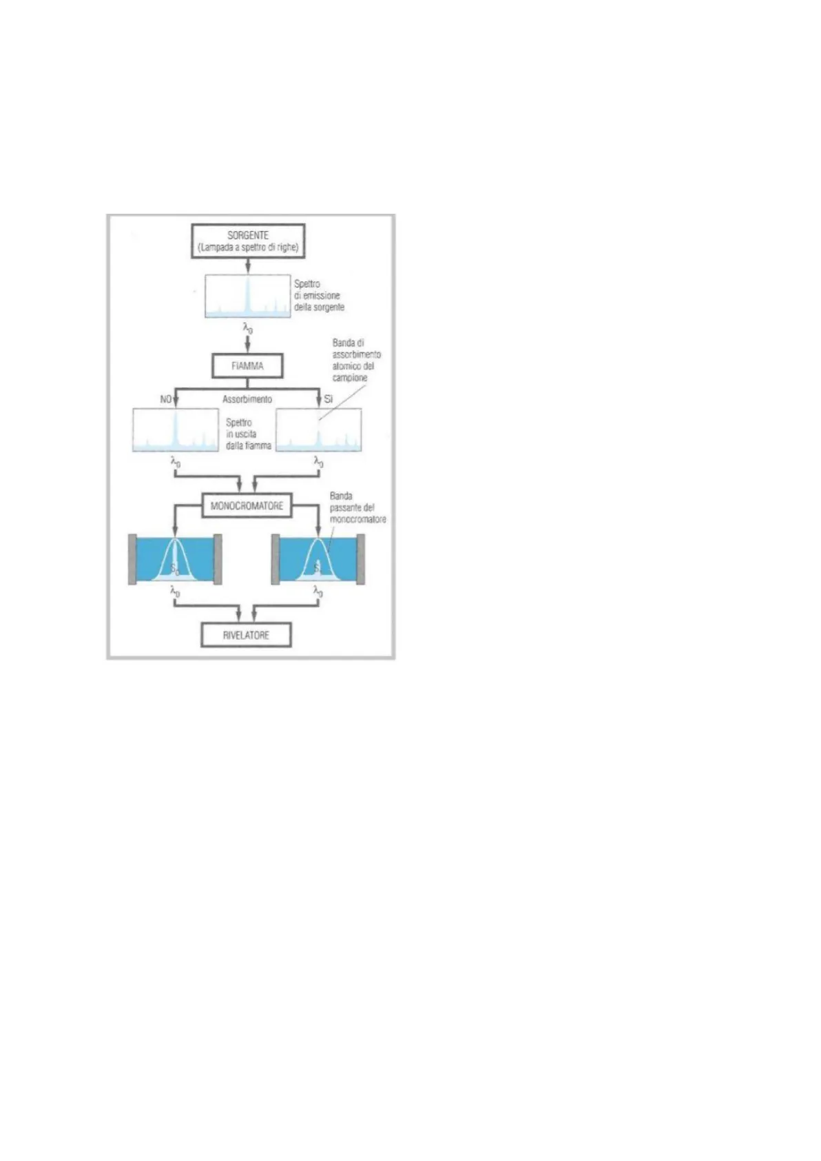 -Sorgente La lampada emette la riga di risonanza analitica X e passa attraverso la fiamma. In spettroscopia atomica l'analita è presente sotto forma di nube atomica. -Fismma In spettroscopia atomica l'analita è presente sotto forma di nube atomica, grazie all'azione dell'apparato atomizzatore. Essendo impossibili vibrazioni e rotazioni degli atomi singoli, lo spettro di assorbimento atomico è a righe, non a bande (una banda è l'inviluppo di numerosissime righe). Pertanto la radiazione incidente sugli atomi dell'analita sarà incentrata su una delle lunghezze d'onda relative al suo spettro di assorbimento (emissione).